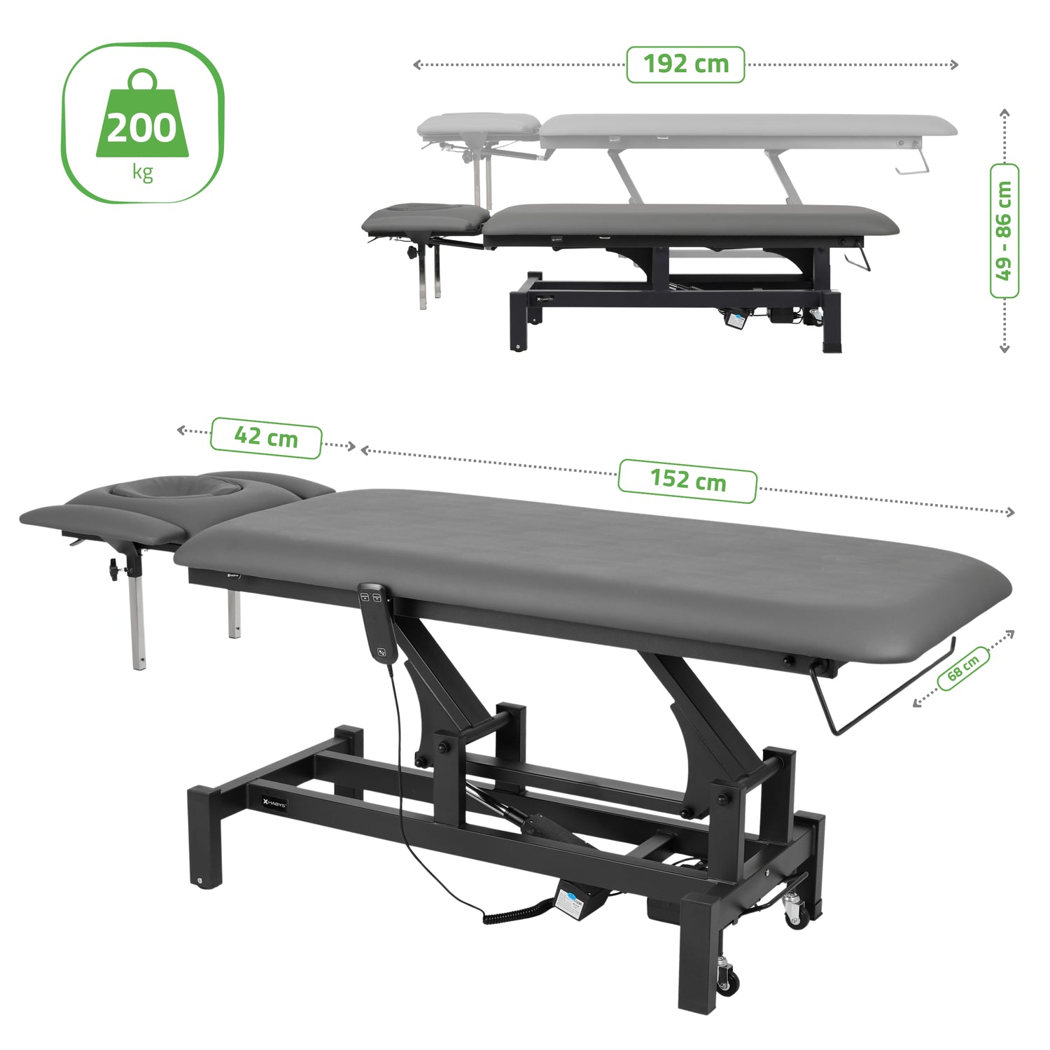 - Robuste Konstruktion: Die erhöhte Festigkeit des Rahmens sorgt dafür, dass die maximale Tragfähigkeit der Liege 200 kg beträgt, was eine sichere Nutzung auch bei höherer Belastung ermöglicht. Dank der stabilen Konstruktion ist die Liege unempfindlich gegen Vibrationen und Verschiebungen während der Behandlungen.