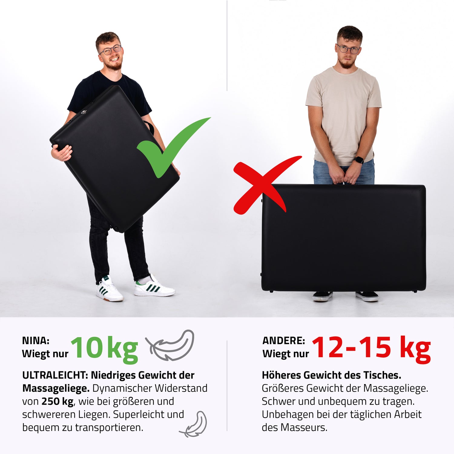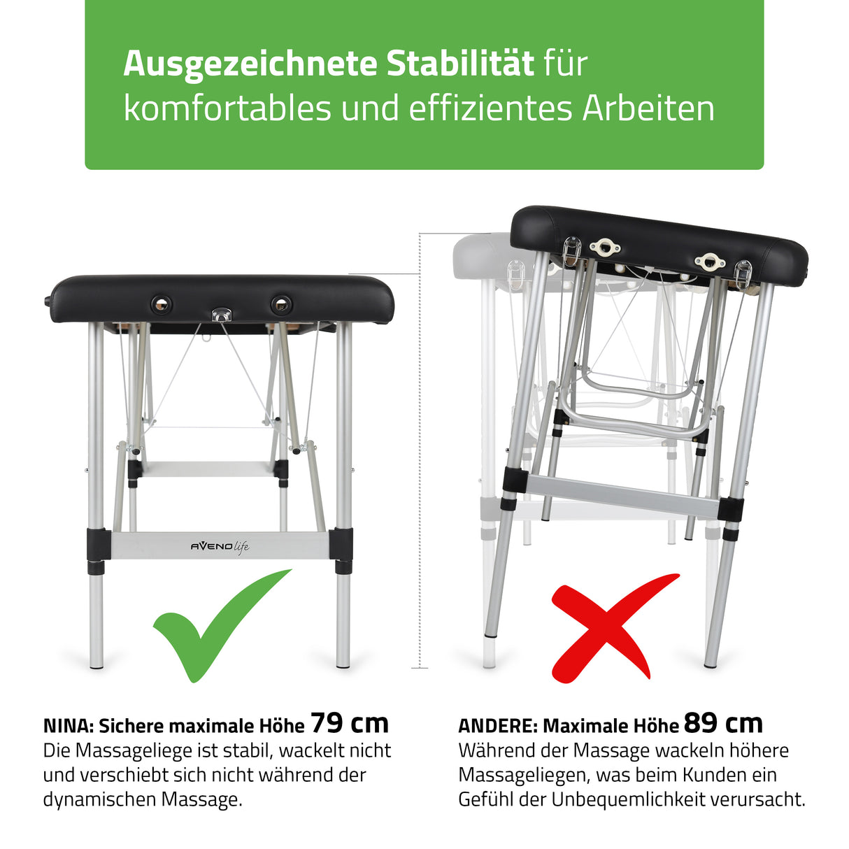 Nina ist eine ultraleichte Aluminium-Massageliege der Marke AVENO LIFE mit einer zweisegmentigen Liegefläche. Dieses Modell ist ideal für alle, die bewährte Lösungen zu einem wirtschaftlichen Preis suchen. Comfy Base Polsterung.