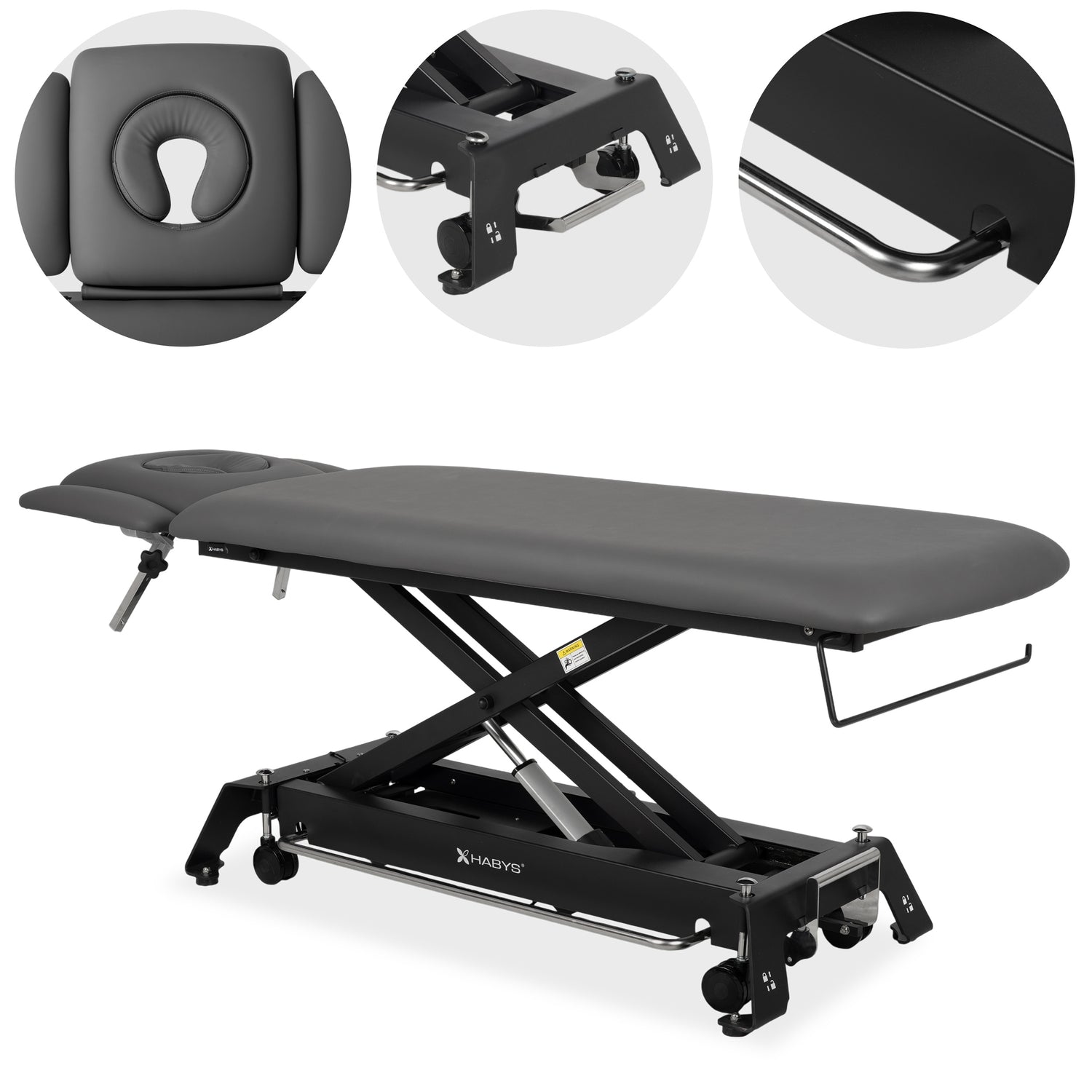 • Elektrisch verstellbare stationäre Massageliege der Marke Habys.