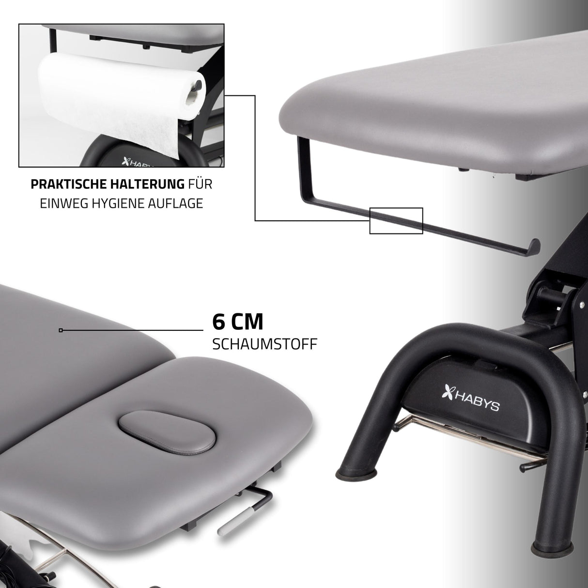 Robuste und langlebige Polsterung mit natürlichem, lederähnlichem Griff. Widerstandsfähig gegen Schmutz, Öle und Desinfektionsmittel. Die Farbe der Polsterung behält über viele Jahre ihre Intensität. Getestet - erfüllt die Habys Qualitätskriterien.