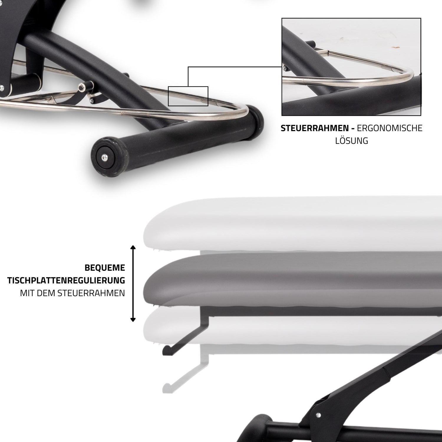 - höhenverstellung der Tischplatte über einen Edelstahl-Steuerungsrahmen
