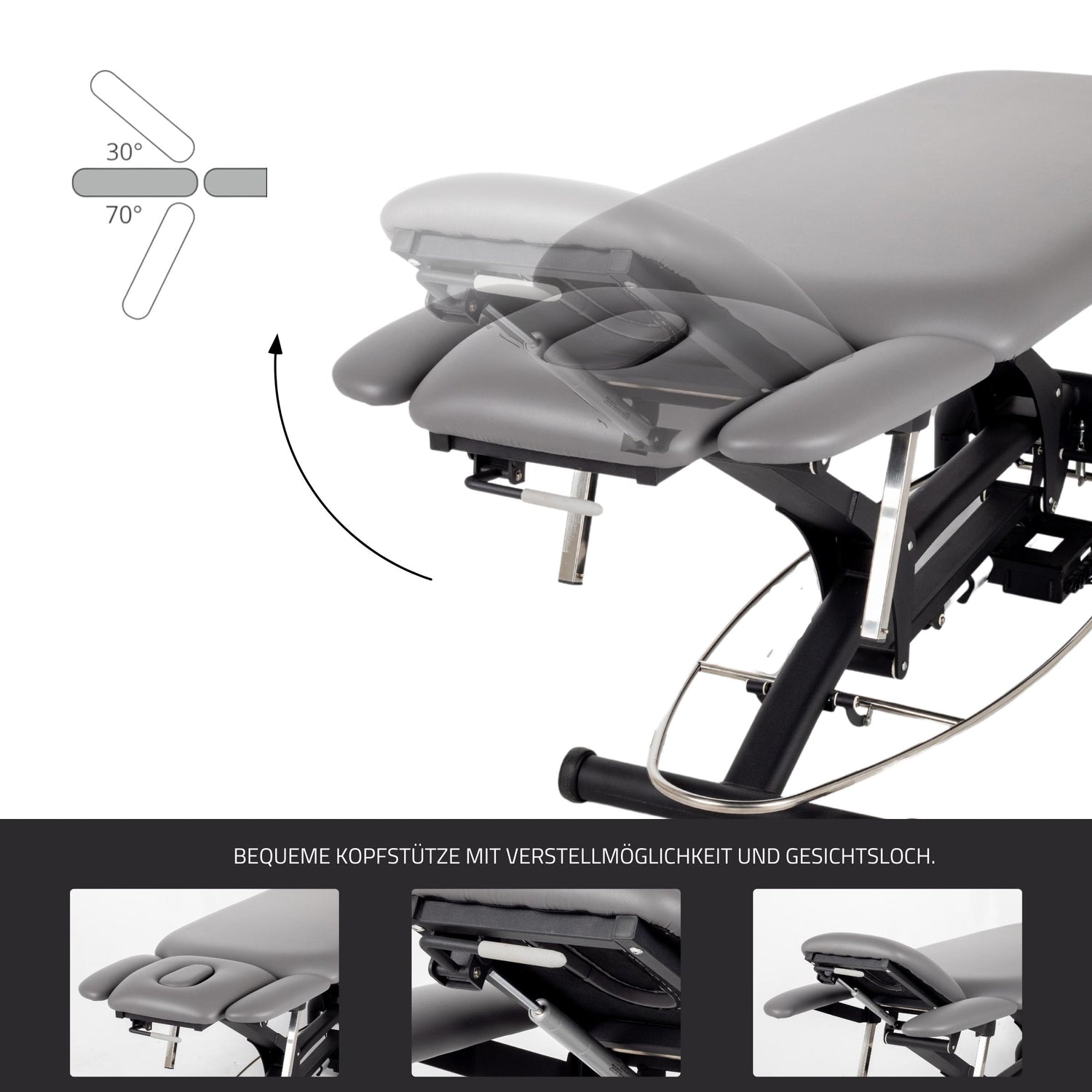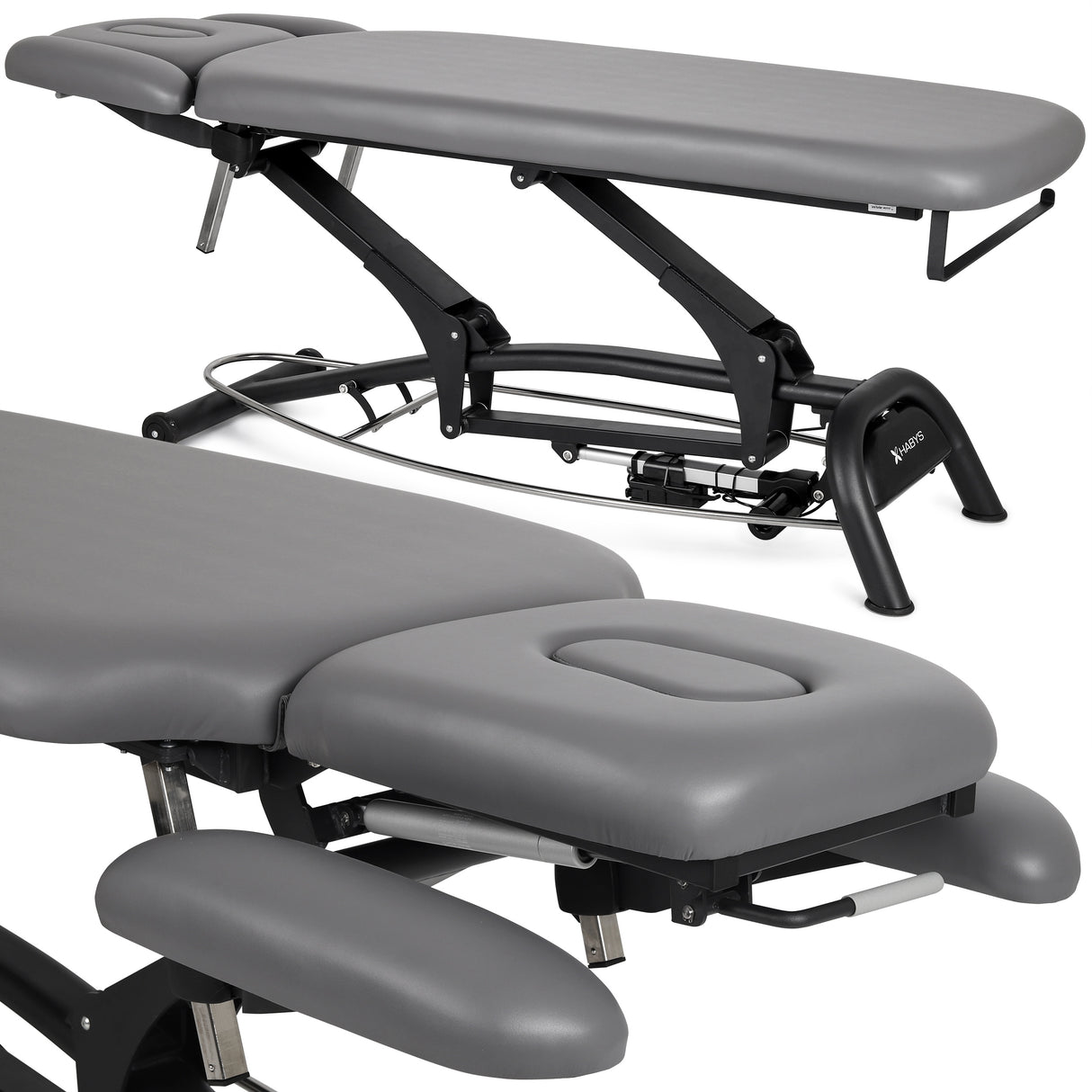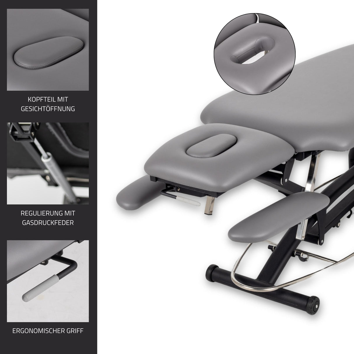 Die Massageliege Agila 4 ist mit einem speziellen Mechanismus zur Höhenverstellung ausgestattet, der über eine Antikollisionsfunktion verfügt. Dies bedeutet, dass für das Anheben der Liege der Mechanismus gedrückt und für das Absenken nach oben gezogen werden muss. Diese innovative Funktion gewährleistet eine sichere und effiziente Anpassung der Höhe und minimiert das Risiko unerwünschter Kollisionen mit Gegenständen oder Personen in der Nähe der Liege.
