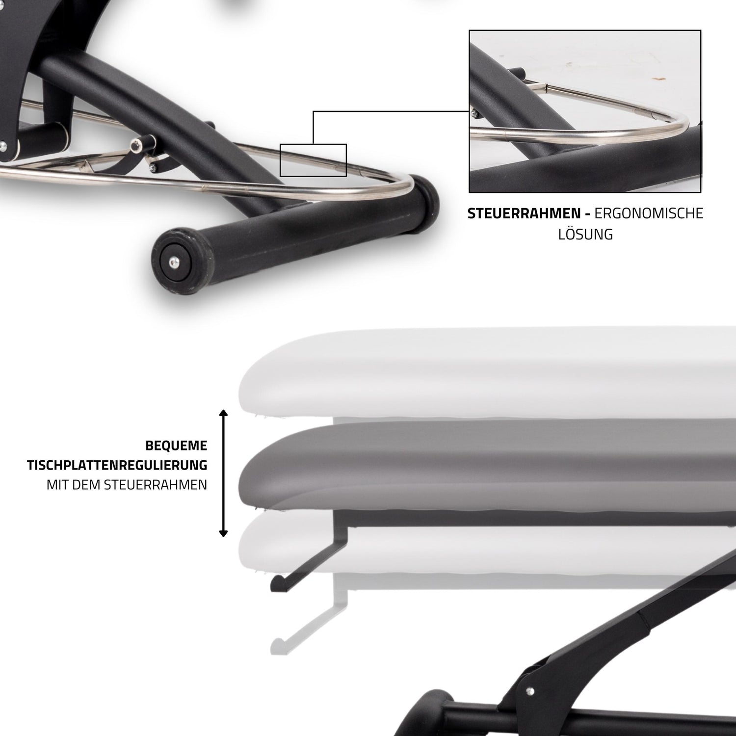 - Höhenverstellung der Tischplatte über einen Edelstahl-Steuerungsrahmen