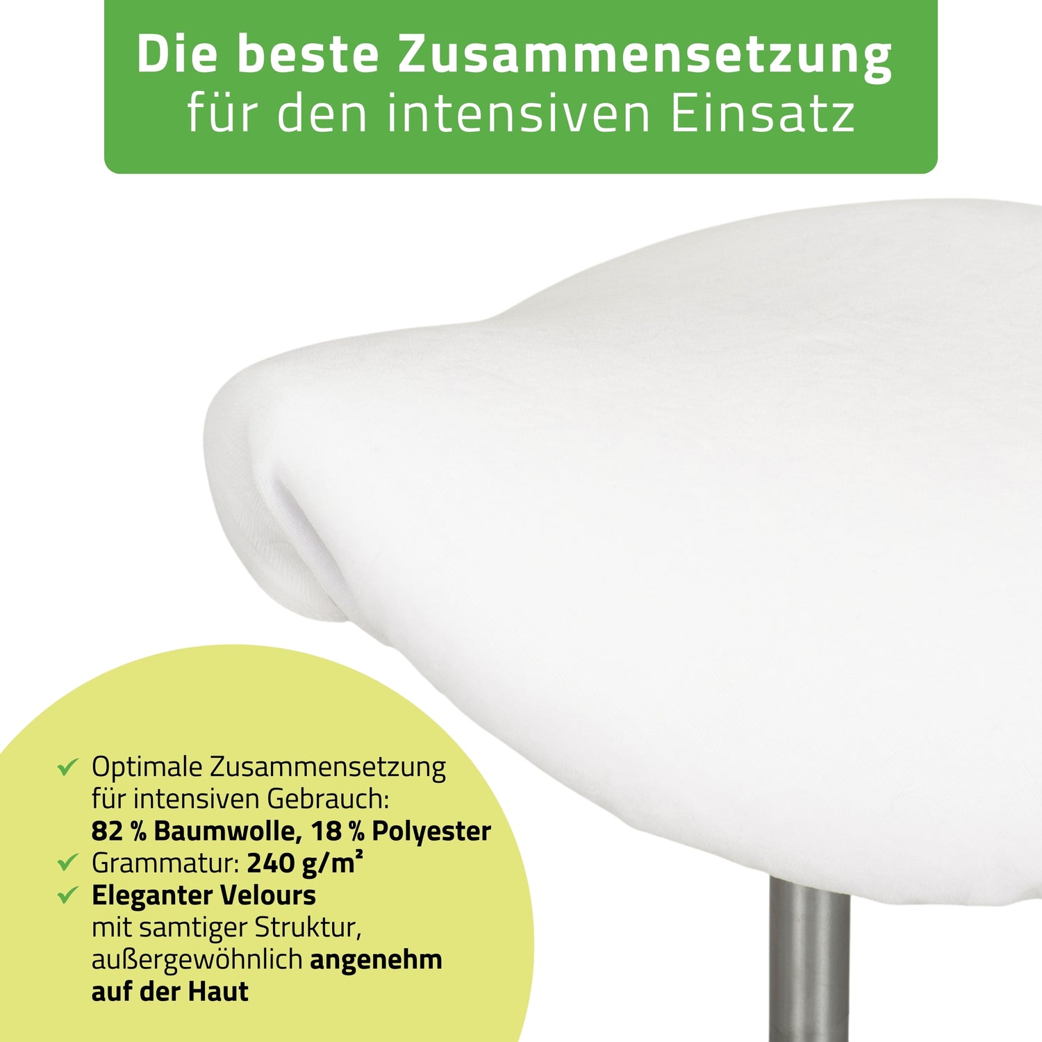 Universelle Passform für Kosmetik- und medizinische Rollhocker: Der Bezug wurde für eine breite Anwendung in professionellen Praxen entwickelt. Dank des elastischen Gummizugs passt er sich ideal an Sitzflächen von Hockern mit einem Durchmesser von 34 bis 40 cm an.