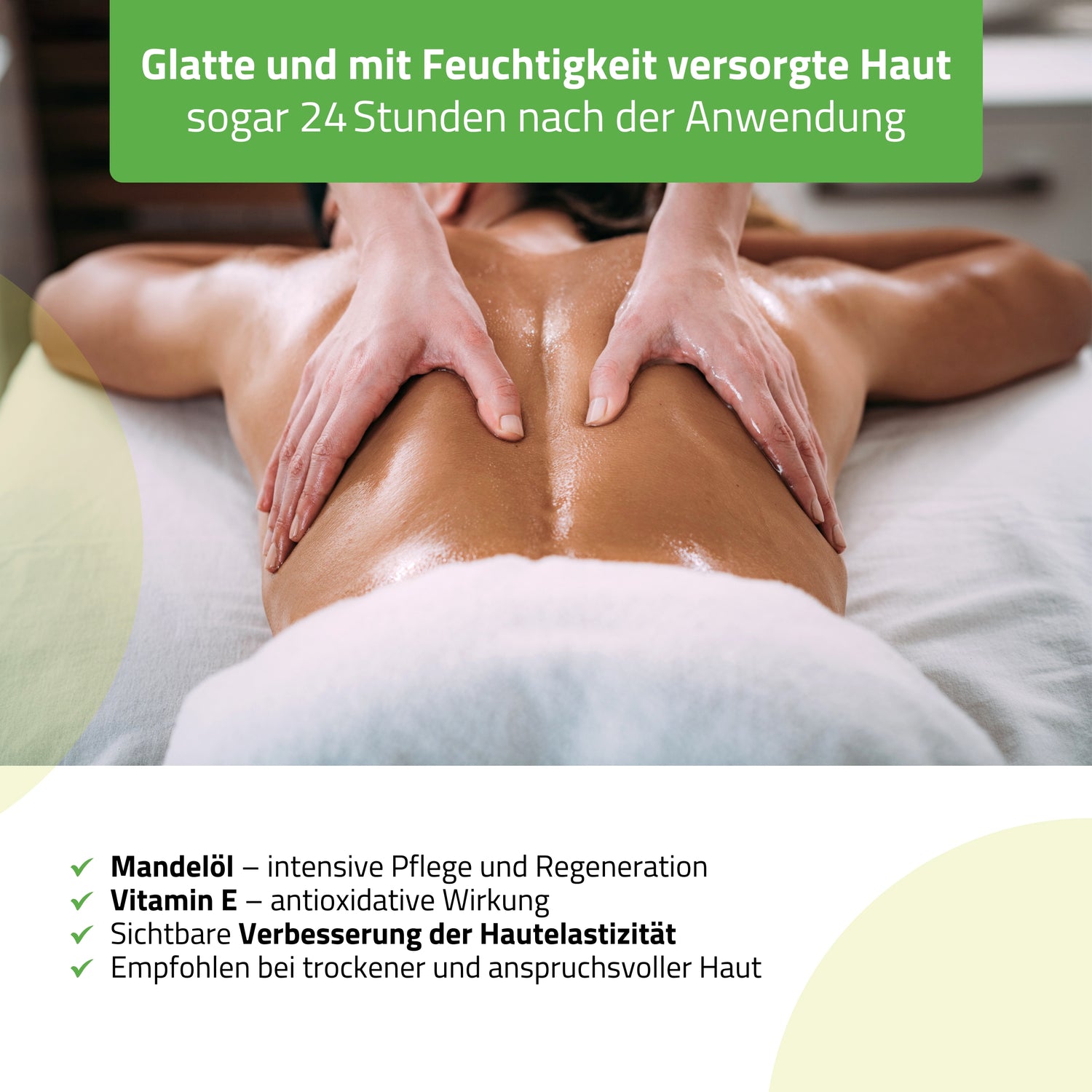 Ein entspannendes Massageöl mit natürlichem Mandelöl und Vitamin E. Der Duft von Jasmin, kombiniert mit einer warmen Vanillenote, hüllt die Sinne ein, beruhigt und schafft eine wohltuende Atmosphäre während der Behandlung. Ideal sowohl für die professionelle Massage als auch für die häusliche Pflege.
