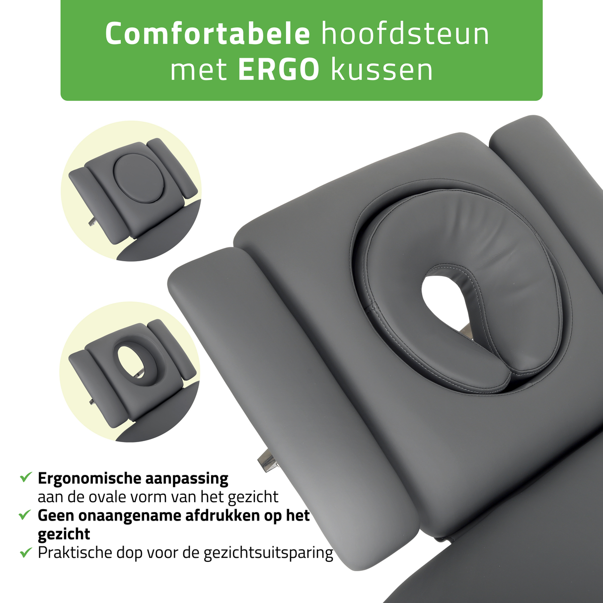 De therapietafel is uitgerust met een 5-segmentig ligoppervlak, een ERGO hoofdkussen en een handbediening, en is bedoeld voor gebruik in professionele massage-, fysio- en revalidatiepraktijken.