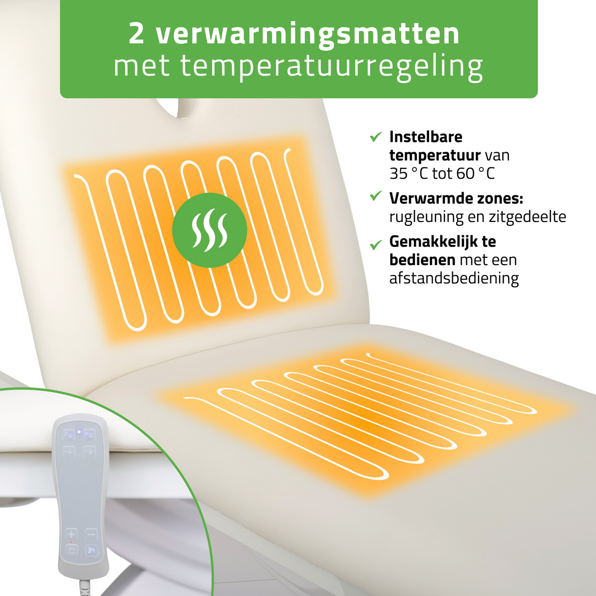 • Verwarmingsfunctie: geïntegreerde verwarmingsmatten in de rugleuning en zitting met temperatuurregeling (35 °C–60 °C) verhogen het comfort bij ontspannings- en schoonheidsbehandelingen.