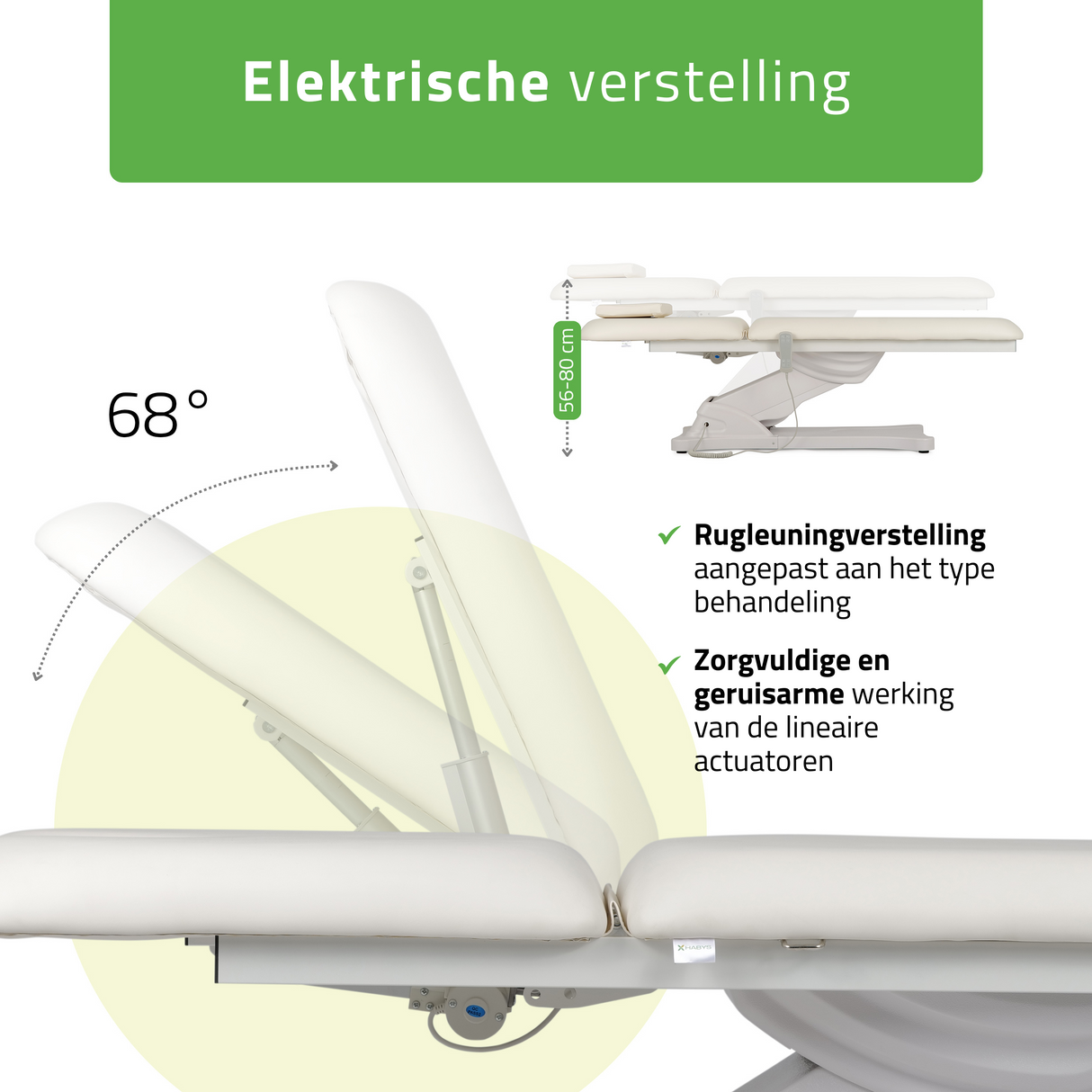 • Elektrische verstelling op twee niveaus: eenvoudige aanpassing van hoogte en kanteling via handbediening, afhankelijk van de behandeling.
