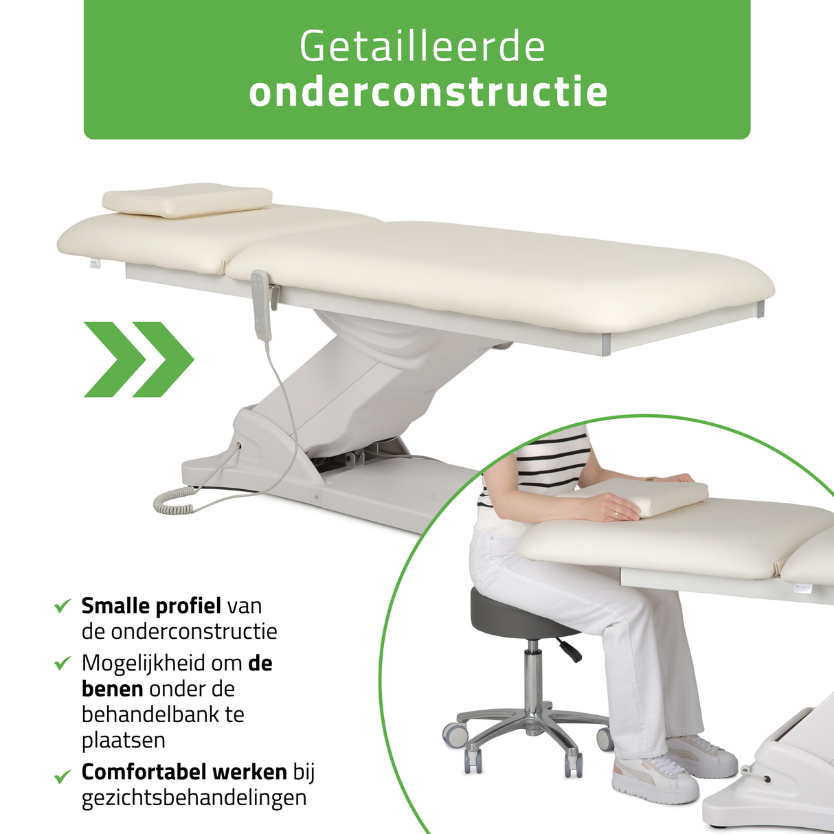 • Ingehouden onderconstructie: vergemakkelijkt de toegang tot de klant vanaf het hoofdeinde en biedt comfortabele beenruimte tijdens de behandeling.