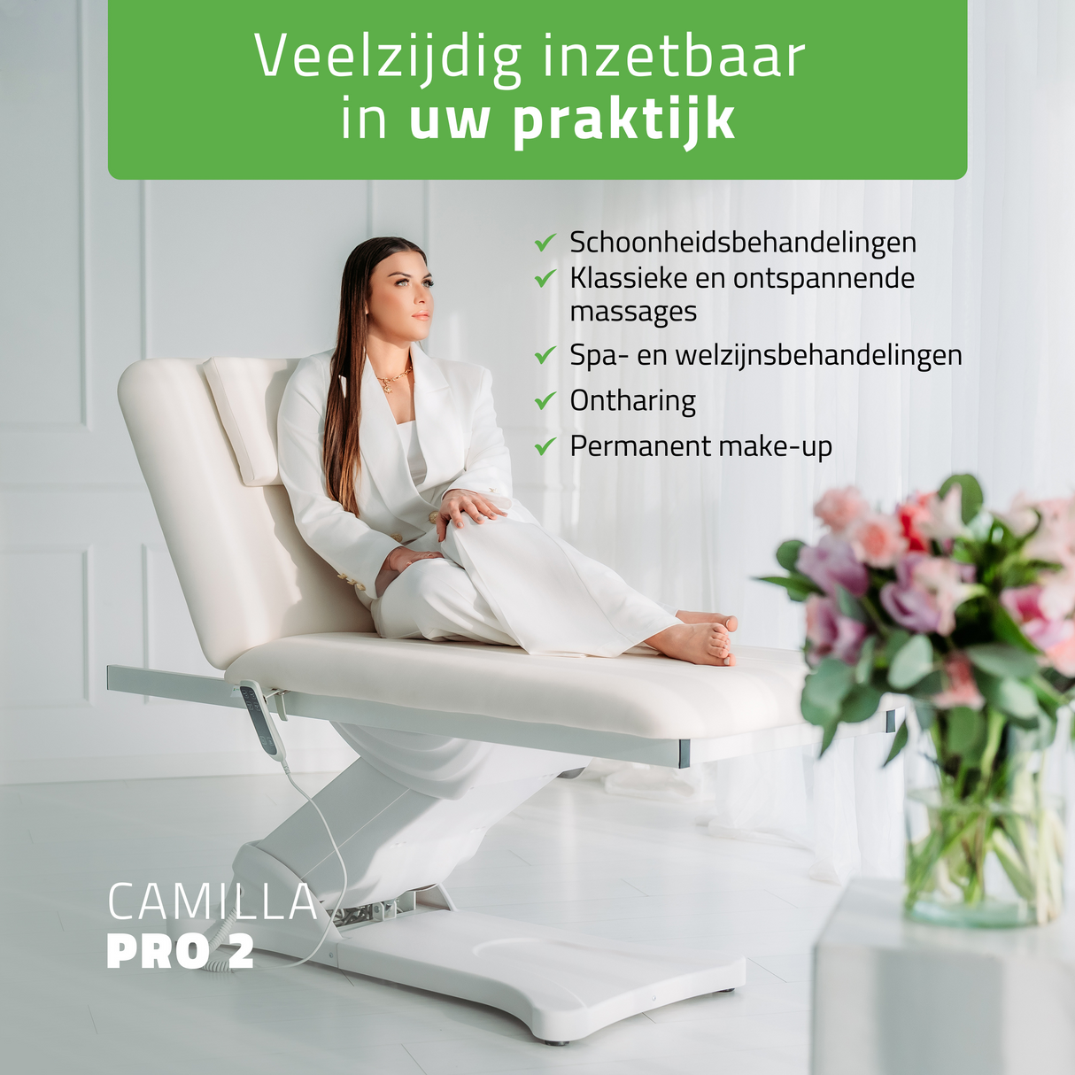 Ze is ideaal voor schoonheidsinstituten, spa salons, massagesalons en andere instellingen die ontspannings-, verzorgings- en ontharingsbehandelingen aanbieden. Dankzij de verwarmingsfunctie en elektrische bediening biedt de Camilla PRO 2 de hele dag door comfort voor zowel de klant als de behandelaar.