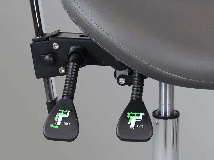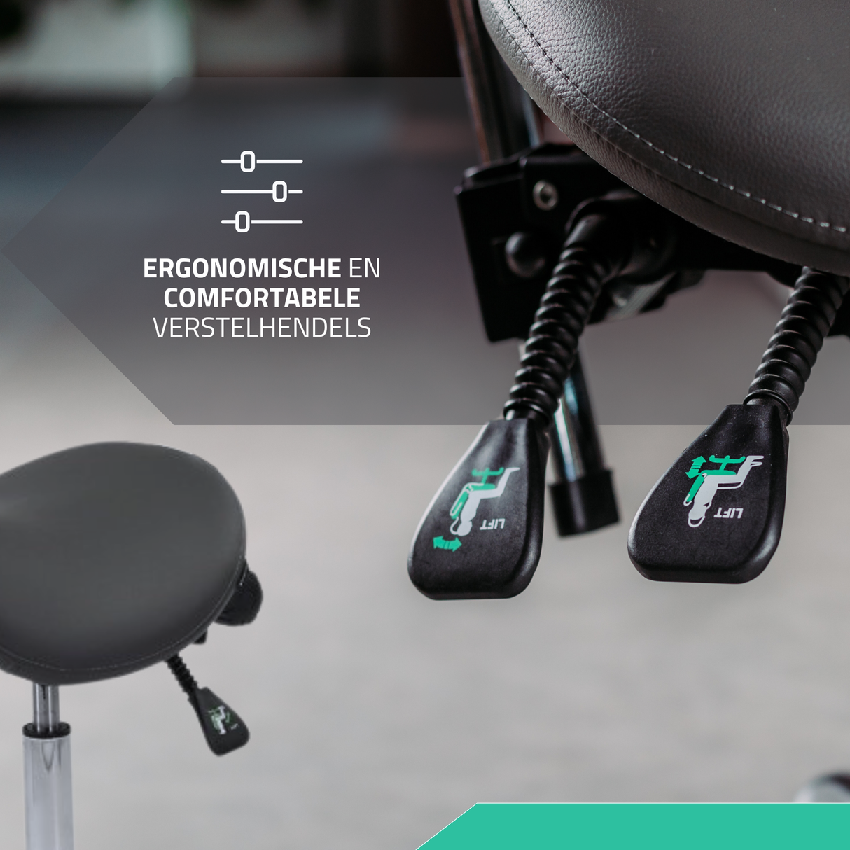 De zadelkruk met rugleuning Diana is uitgerust met een moderne zit- en rugleuningverstelling. De gevormde zitting zorgt voor een optimale gewichtsverdeling, ondersteunt een gezonde lichaamshouding en kan naar voren en naar achteren worden versteld.