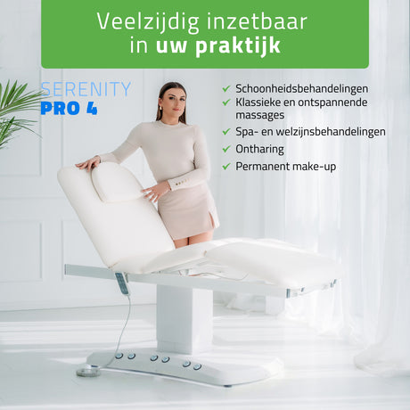 Elektrisch verstelbare behandelstoelen met een ergonomisch design en comfortabele bekleding voor nauwkeurige en aangename gezichts- en schoonheidsbehandelingen.