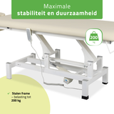- Robuuste constructie: Het stevige frame van de behandeltafel maakt een maximale belasting van 200 kg mogelijk. Hierdoor is de Fortis 1 massagetafel stabiel, veilig en bestand tegen trillingen en verschuivingen tijdens behandelingen.