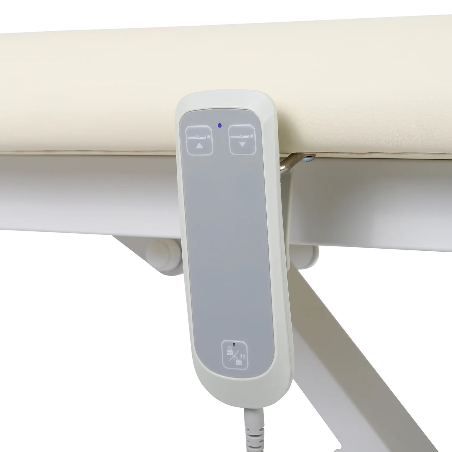 - Handbediening met vergrendelingsfunctie: Met de handbediening kan de hoogte van de behandeltafel eenvoudig en snel worden aangepast. De extra vergrendelingsfunctie op de afstandsbediening voorkomt ongewenste hoogteveranderingen.