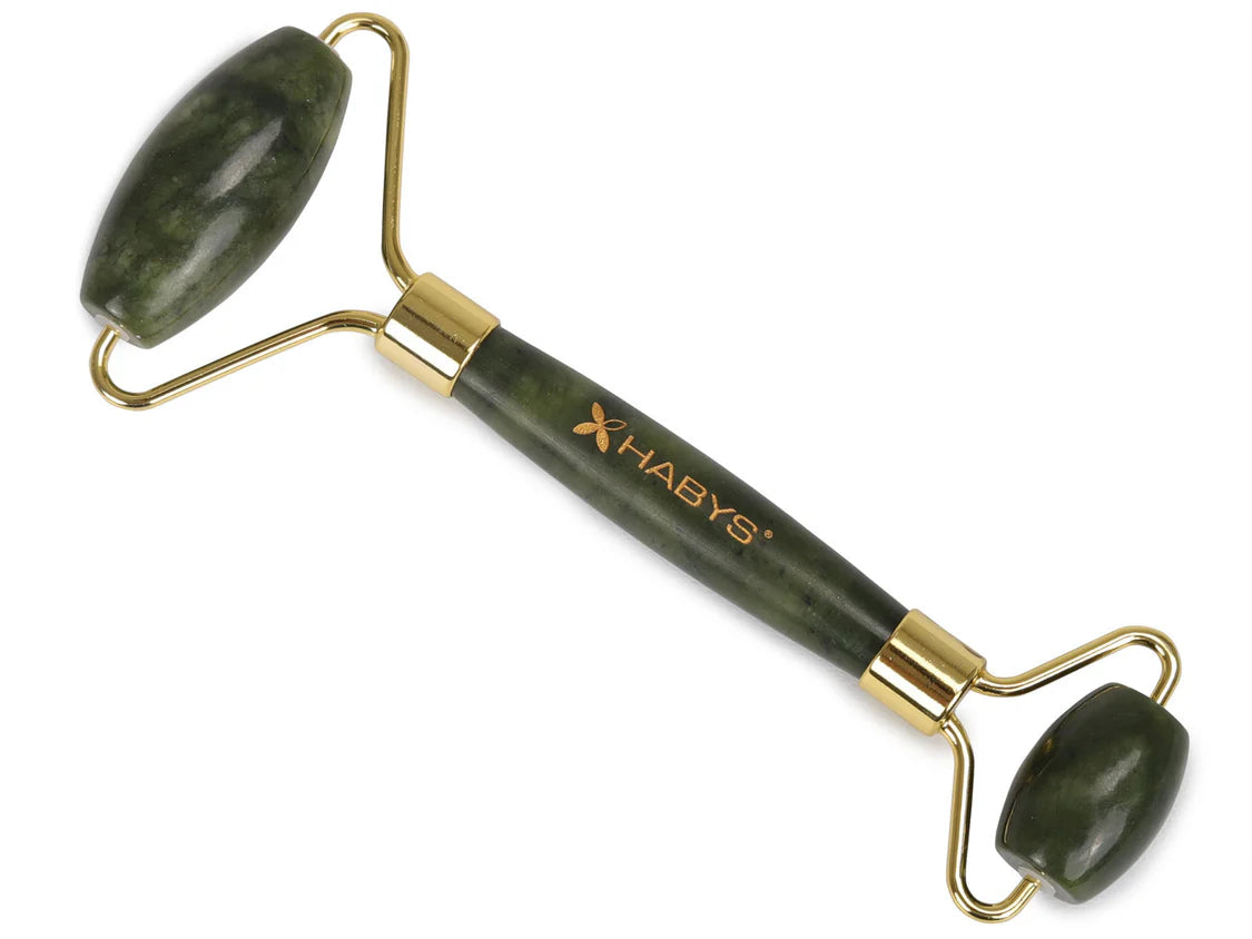 Roller van natuurlijk jadeïet met metalen details in goudlook. Een stille, zachte werking en de subtiele gravure „Habys“ benadrukken de esthetiek en kwaliteit van het product.