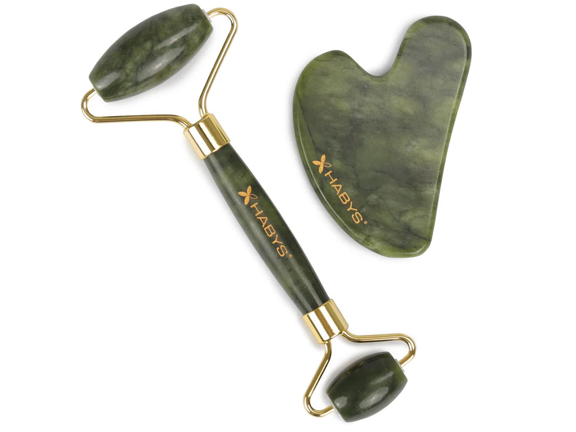 De HABYS Gezichtsmassage Set combineert de therapeutische werking van jadeïetsteen en -roller met de weldadige eigenschappen van 100% natuurlijke amandelolie.