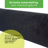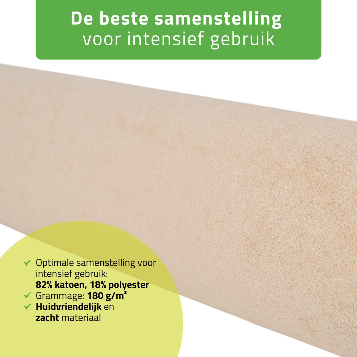 Optimale samenstelling voor intensief gebruik: 82% katoen, 18% polyester: natuurlijk katoen zorgt voor zachtheid en absorptie, terwijl de toevoeging van polyester de duurzaamheid en elasticiteit verhoogt.