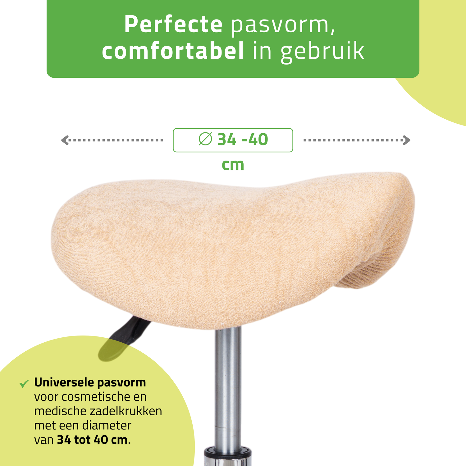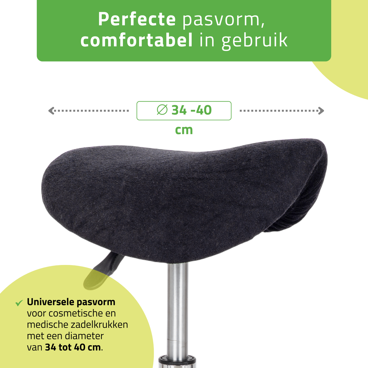 Universele pasvorm voor cosmetische en medische rollkrukken: de hoes is ontwikkeld voor breed gebruik in professionele praktijken. Dankzij de elastische rand met elastiek past hij ideaal op zitvlakken van krukken met een diameter van 34 tot 40 cm.