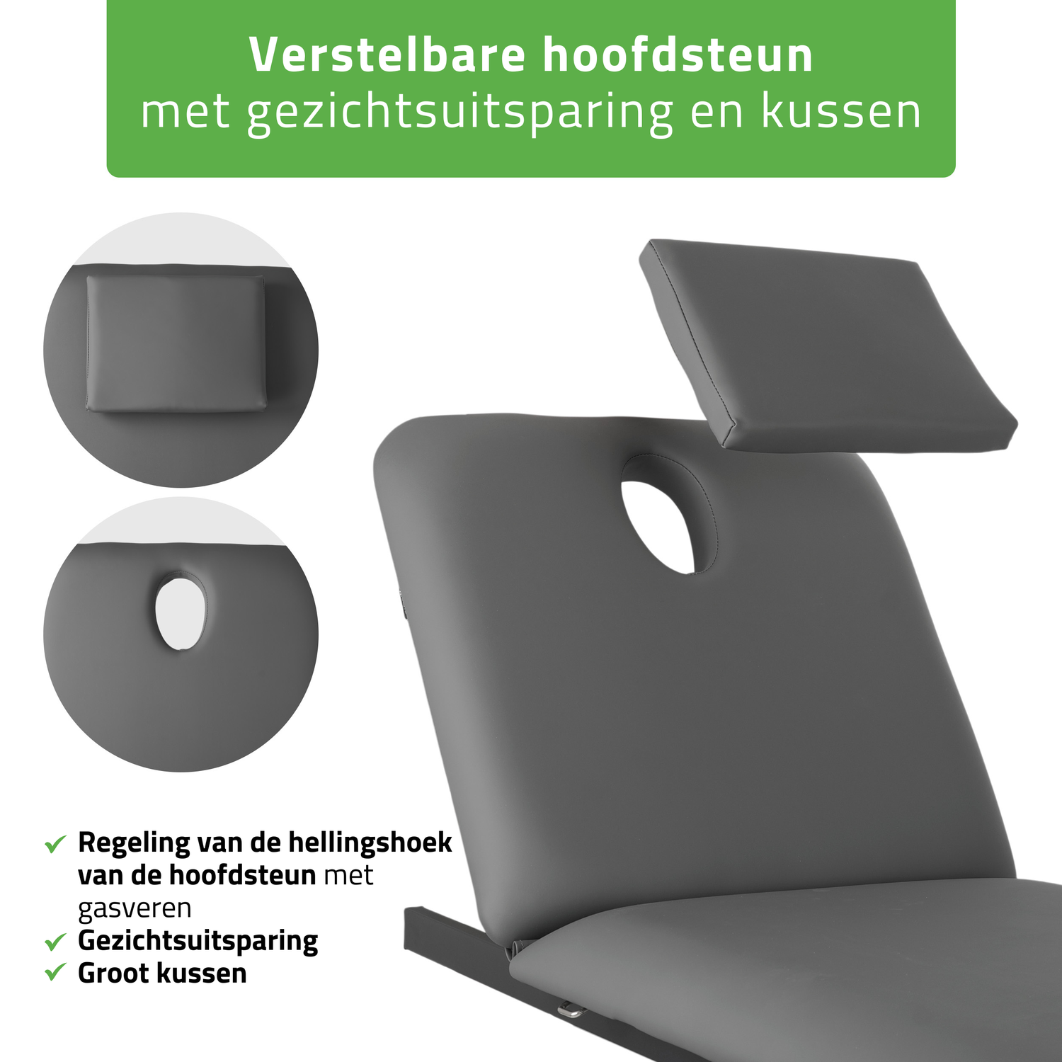 - Verstelbare hoofdsteun met gezichtsuitsparing en kussen: De verstelbare hoekspecificatie van de hoofdsteun, evenals het gasveermechanisme, zorgen voor een stille en precieze aanpassing van de patiëntenpositie tijdens de therapie. De gezichtsuitsparing in de tafel maakt vrij ademen mogelijk in de "buikligging". Het grote kussen bedekt het uitsnede en biedt comfortabele ligpositie in "rug-" of zijligging.