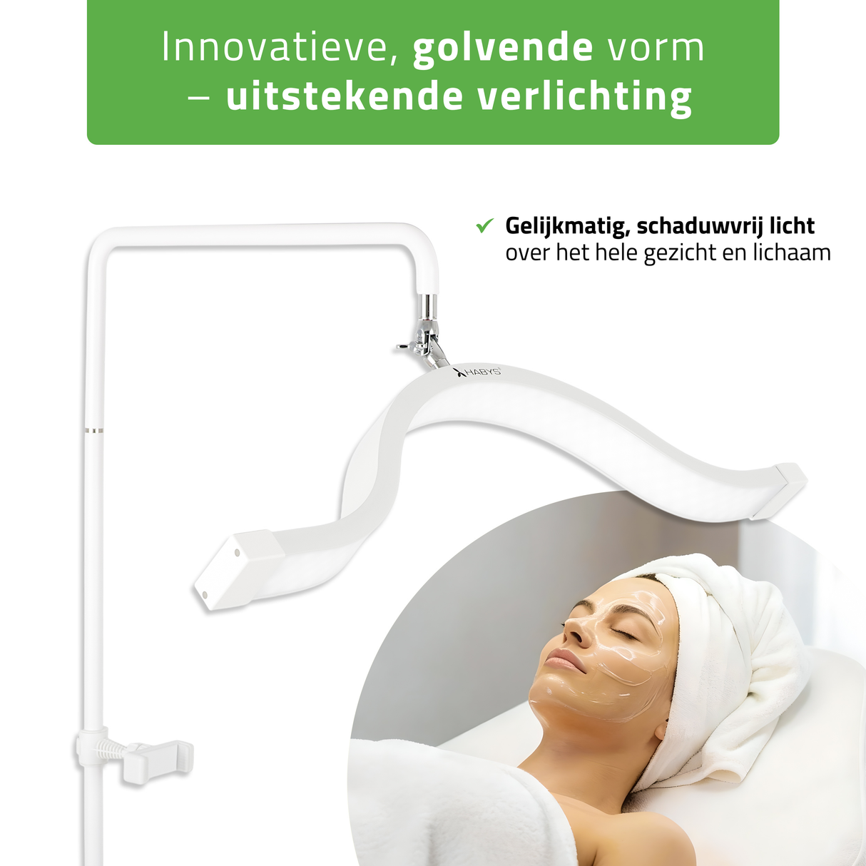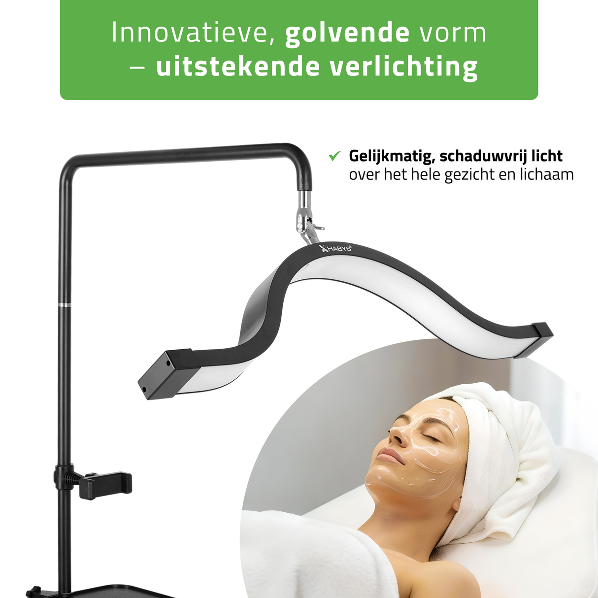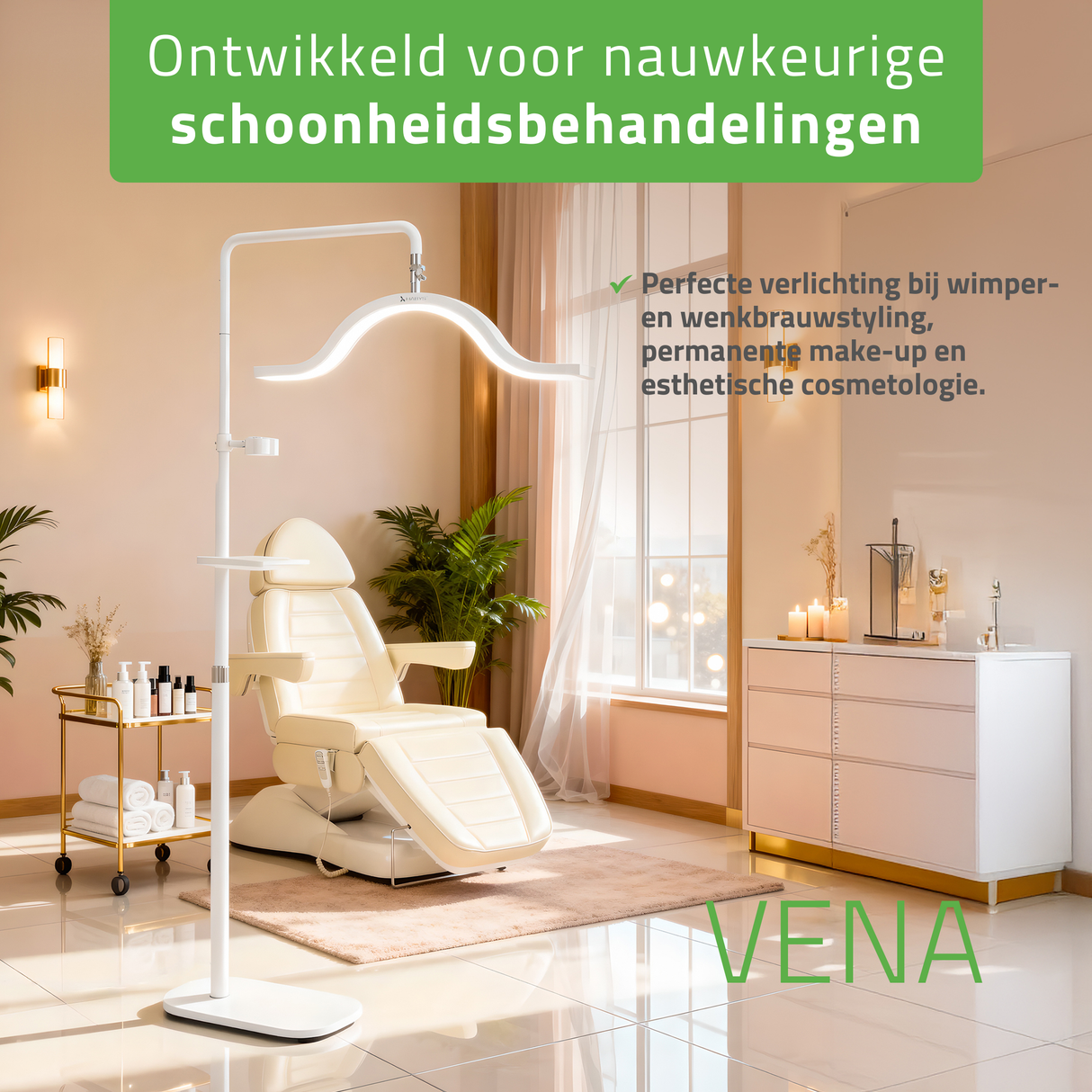 • Innovatief golvend design: In tegenstelling tot conventionele lampen met een halfcirkelvormig of recht profiel biedt de VENA-lamp dankzij zijn golvende constructie aanzienlijk meer werkcomfort en betere lichtkwaliteit. De gestroomlijnde, zacht gebogen vorm geeft het apparaat niet alleen een modern en elegant uiterlijk, maar beïnvloedt vooral de lichtverspreiding, wat leidt tot een optimale verlichting van gezicht en lichaam.