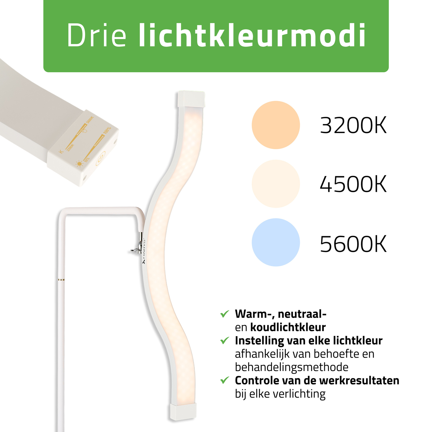 • Drie kleurtemperatuurmodi: Warm, neutraal en koud – ze maken het mogelijk om de lichtkleur aan te passen afhankelijk van de behoefte en het type behandeling, evenals de controle van de werkresultaten onder elke verlichting.