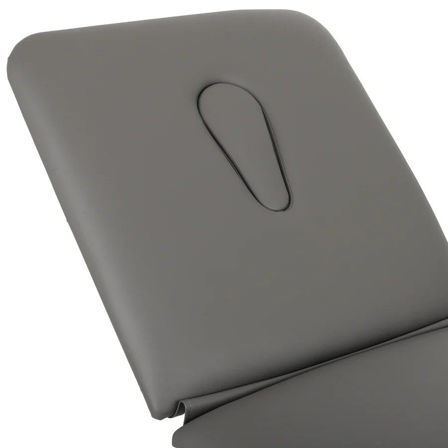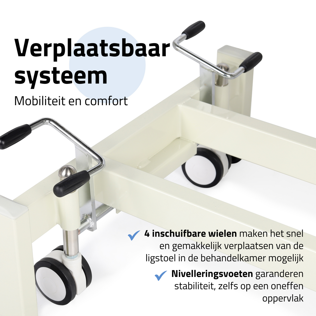 - Plaats voor het gezicht: Een speciaal gevormd vlak in de verstelbare hoofdsteun maakt een comfortabele positionering van het gezicht in buikligging mogelijk, zodat de patiënt een ergonomische houding kan aannemen zonder het hoofd te draaien.