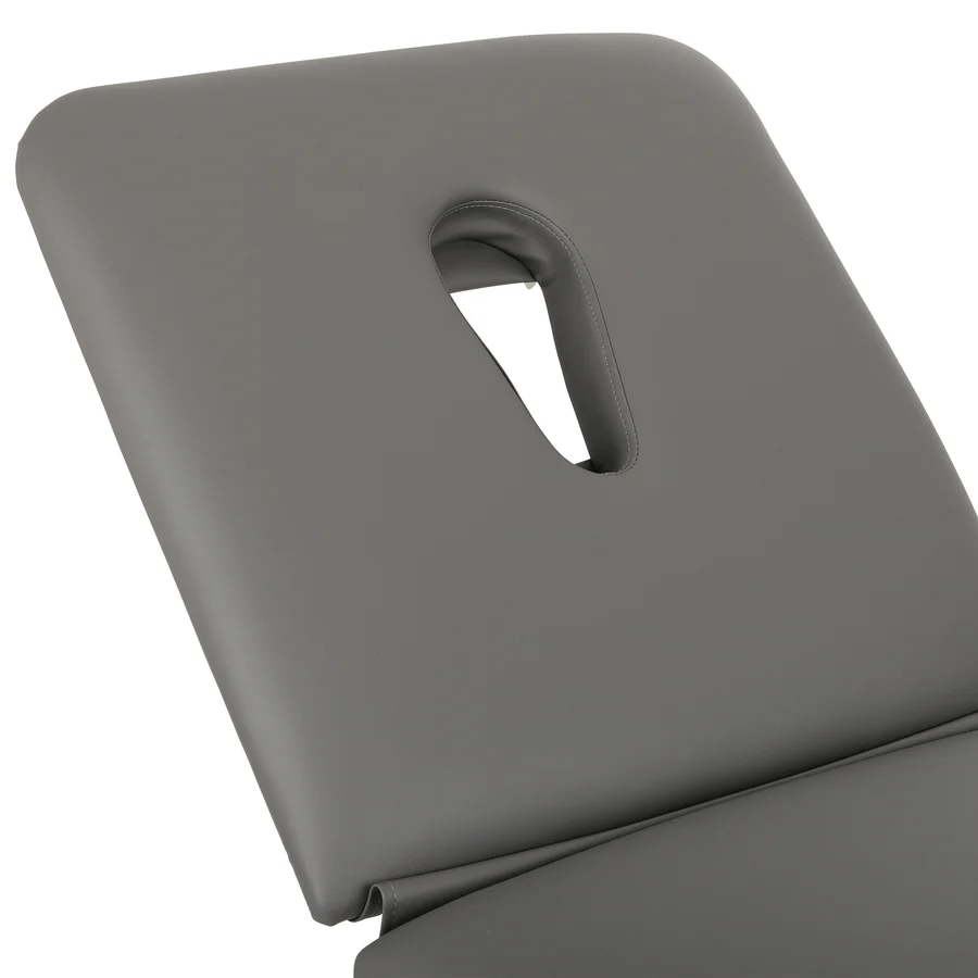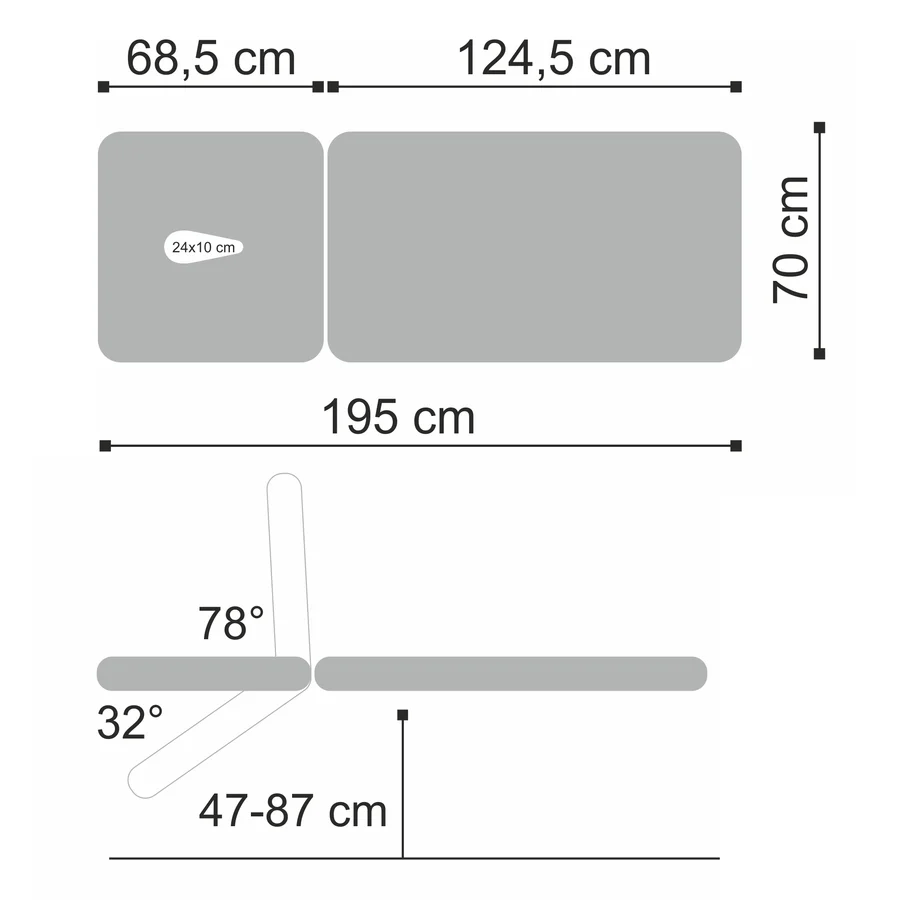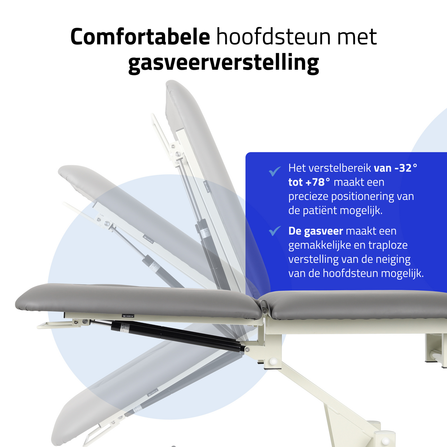 - 2-segmentig ligvlak: Met universele toepassing in gedachten biedt het ligvlak met de afmetingen 195 x 70 cm en een verstelbare hoofdsteun de mogelijkheid om de positie van de patiënt aan te passen aan verschillende therapeutische behandelingen.