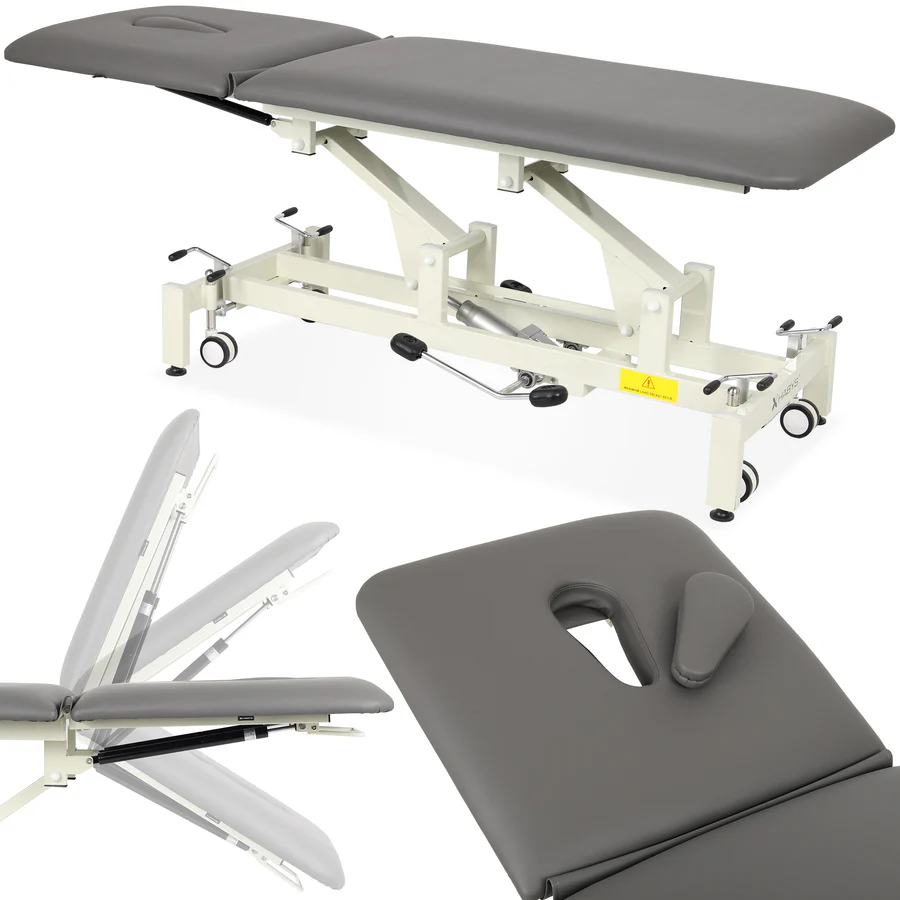 2-segmentig massagetafel met hydraulische hoogteverstelling, ergonomisch ontwerp en hoge stabiliteit, ideaal voor fysiotherapie, massage en revalidatie.