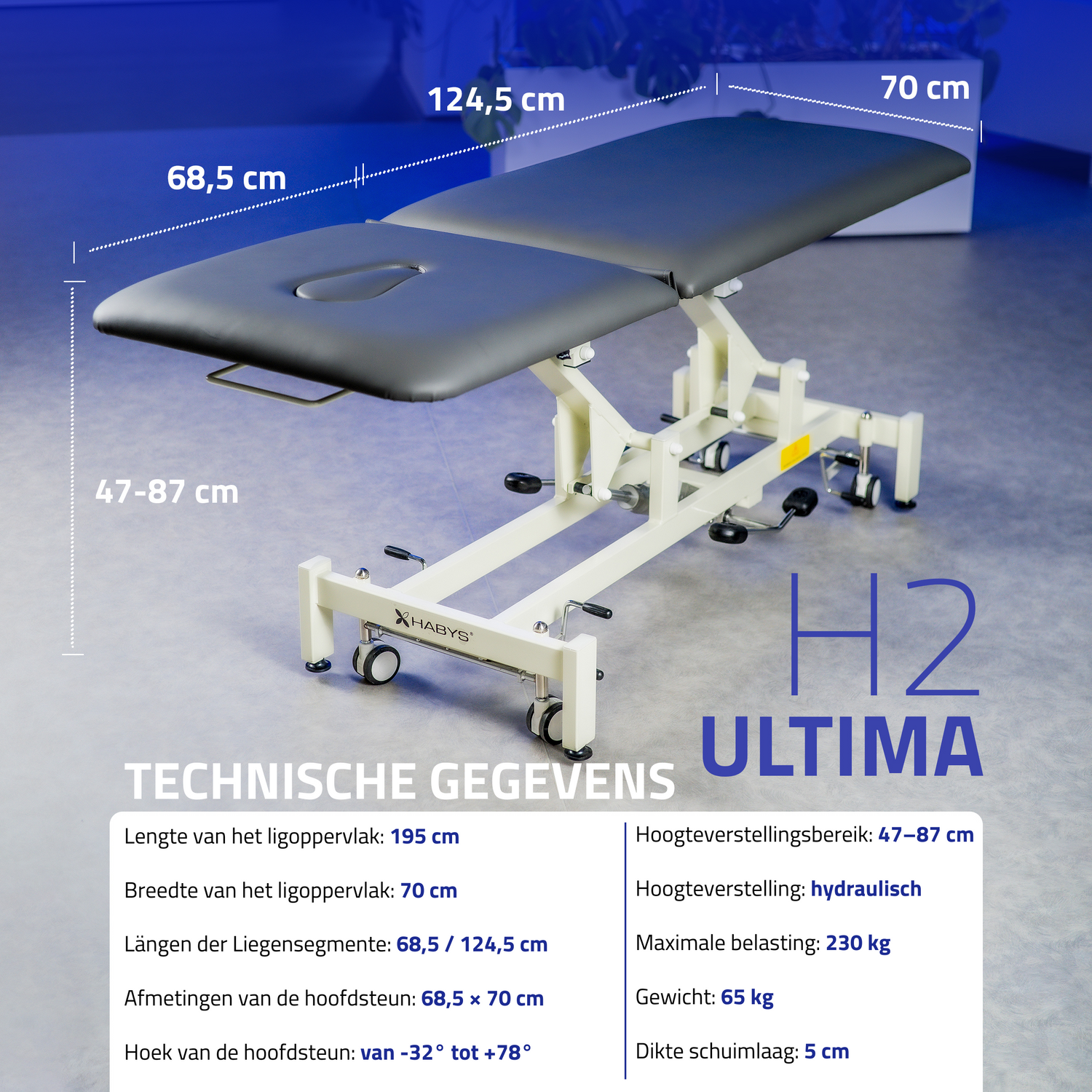 De massagetafel ULTIMA H2 met een 2-segmentig ligvlak is speciaal ontwikkeld voor professionals in de fysiotherapie, massage en revalidatie. Ze biedt volledige ergonomie en uitzonderlijk gebruiksgemak. De stevige constructie en functionele oplossingen garanderen langdurigheid en veiligheid tijdens behandelingen. De massagetafel Ultima H2 is uiterst comfortabel in dagelijks gebruik, wat zowel door patiënten als therapeuten wordt gewaardeerd.