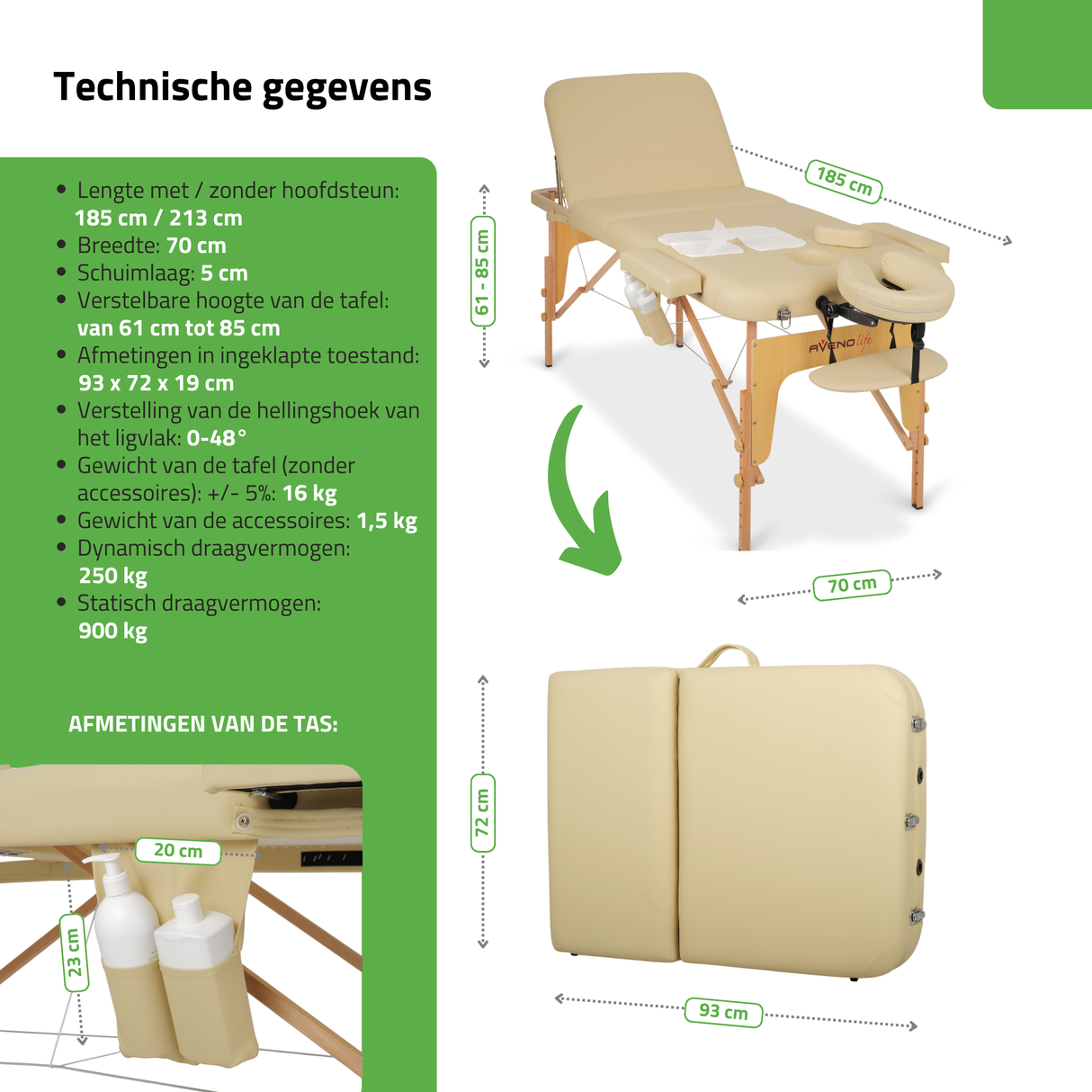 - werkoppervlakte 185 × 70 cm (met hoofdsteun 213 cm) – biedt comfort, ook voor grotere personen.