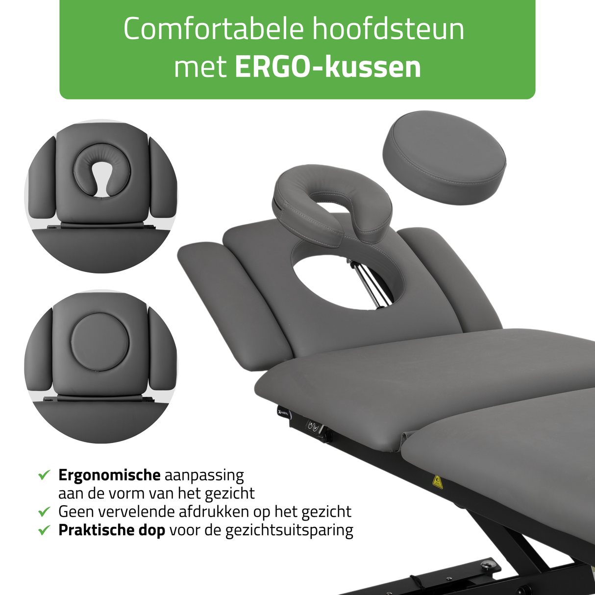 • Verstelbare hoofdsteun met gezichtsuitsparing en ERGO-kussen: Biedt comfort in buik- en rugligging, ook tijdens lange en intensieve therapieën. De stabiele gasveer maakt kanteling mogelijk van –60° tot +40°.