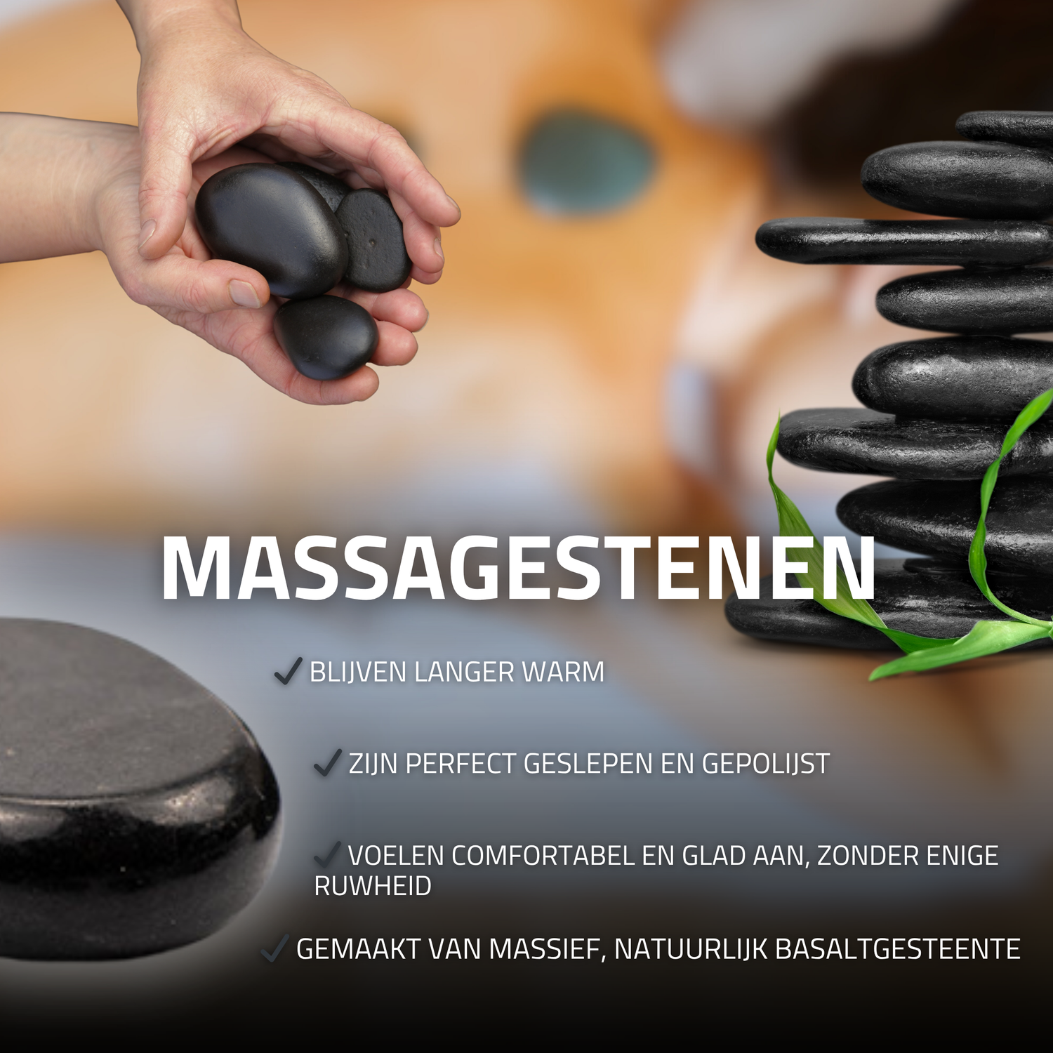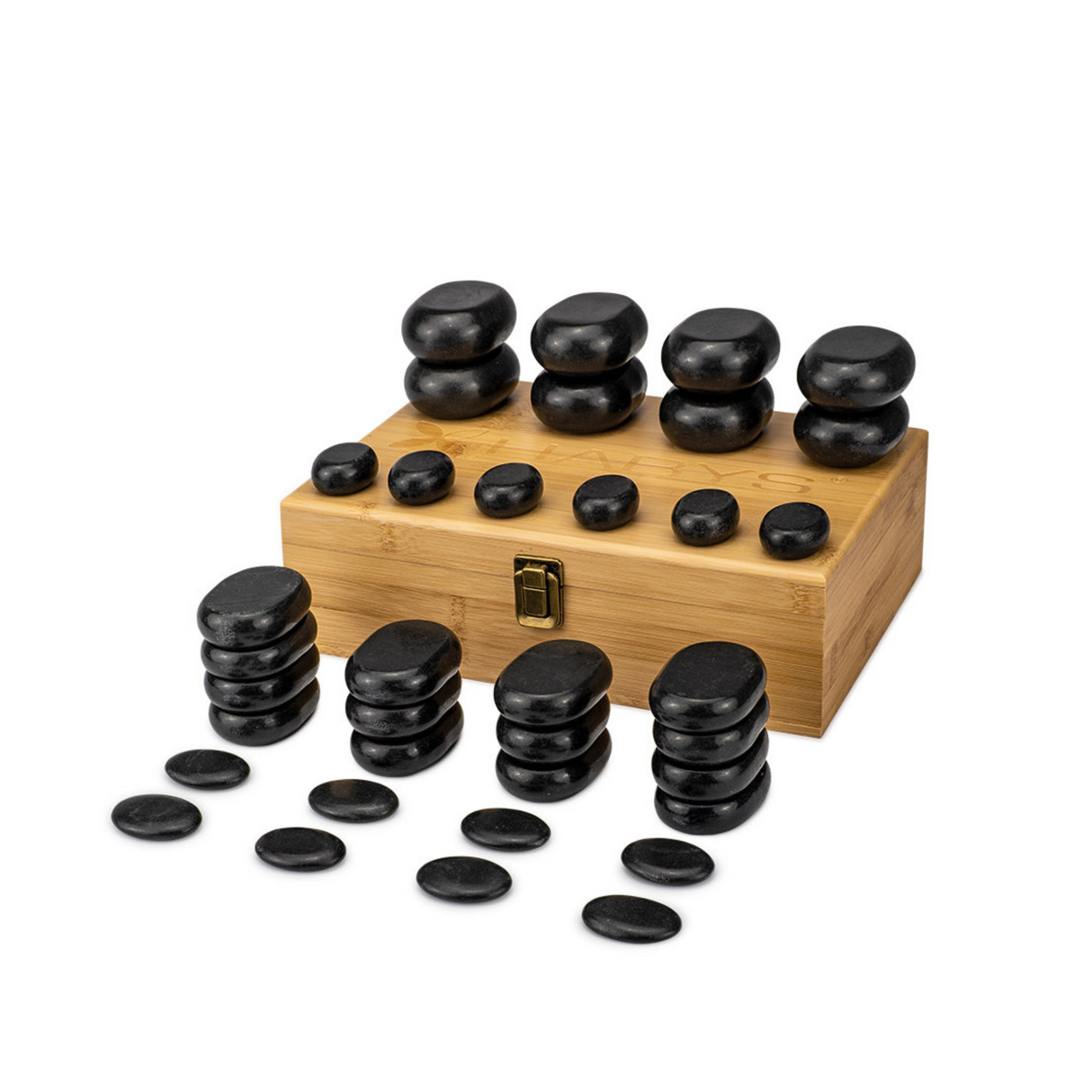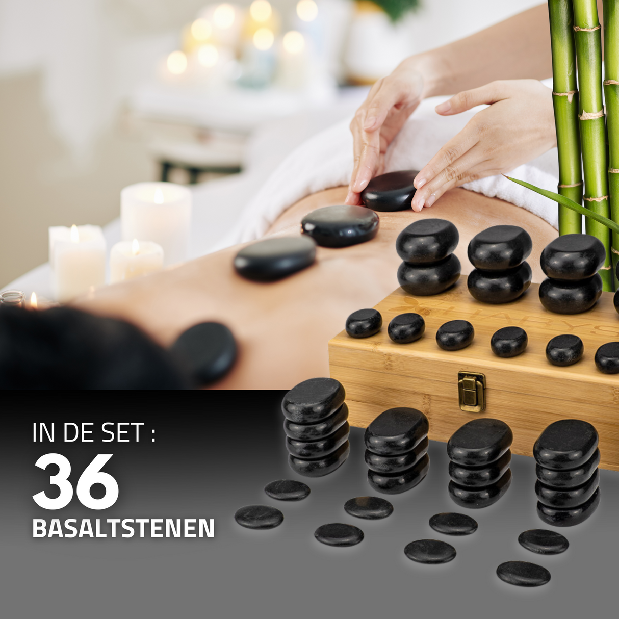 • Bestaat uit 36 basalt massagestenen en een robuuste bamboedoos.