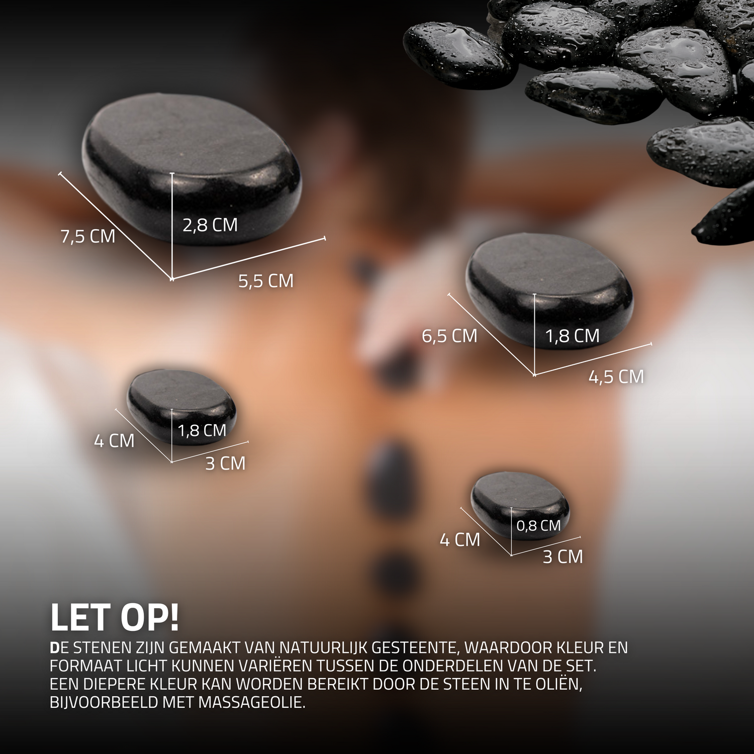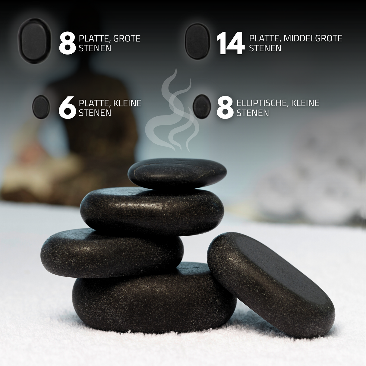 De verscheidenheid aan stenen in deze set maakt een massage van het hele lichaam mogelijk. De grootste stenen zijn bedoeld voor het masseren van het rompgebied, de kleinere stenen worden tussen de vingers van de handen en voeten en op het gezicht gebruikt.