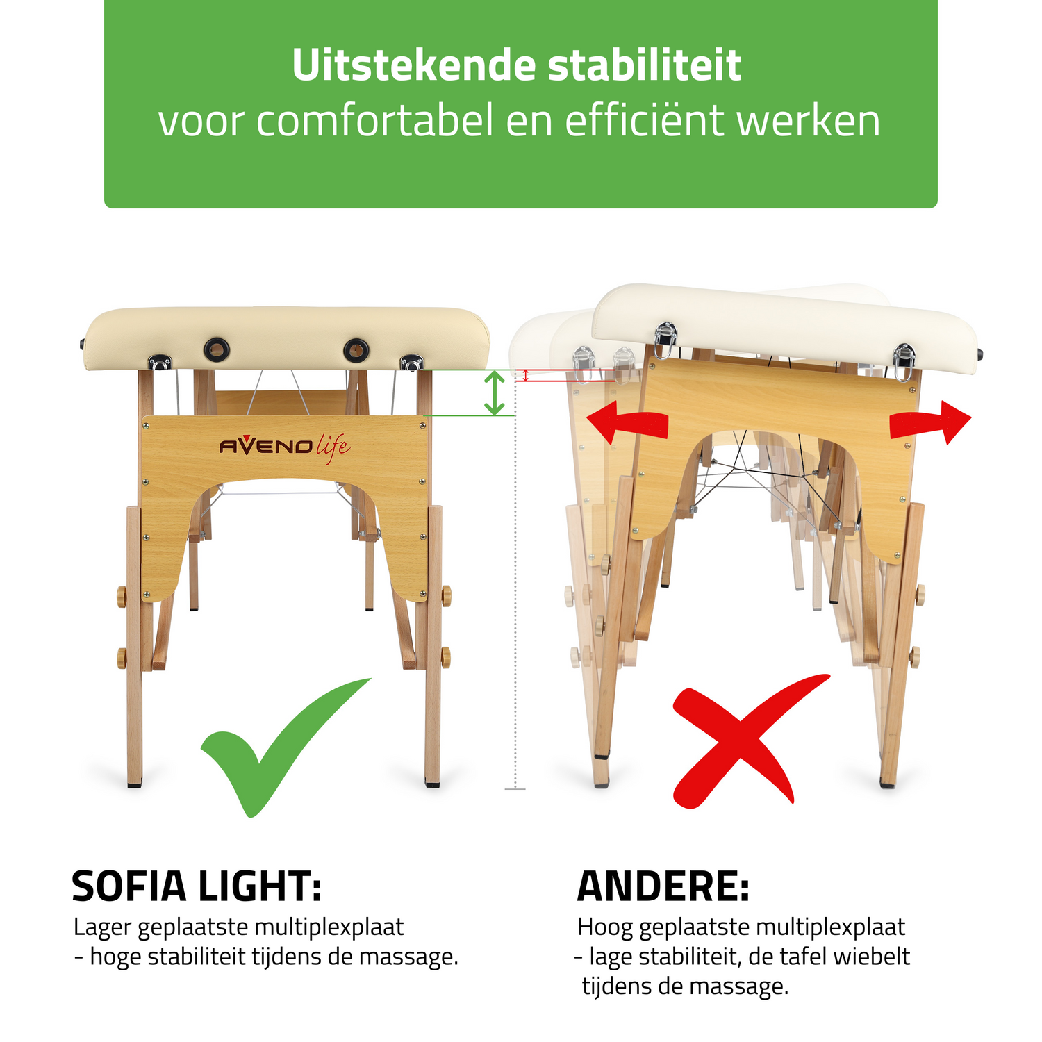 De mobiele massagetafel Sofia Light is een universele, draagbare therapietafel met een robuuste houten constructie, compleet uitgerust met draagtas en accessoires. De tafel kenmerkt zich door een comfortabel tweedelig ligvlak met 5 cm dik schuim, dat uit twee lagen van verschillende hardheid bestaat. De eerste laag is zacht en 4 cm dik, de tweede iets harder en 1 cm dik. Hierdoor is de massagetafel niet alleen comfortabel voor de cliënt, maar ook voor u als therapeut.