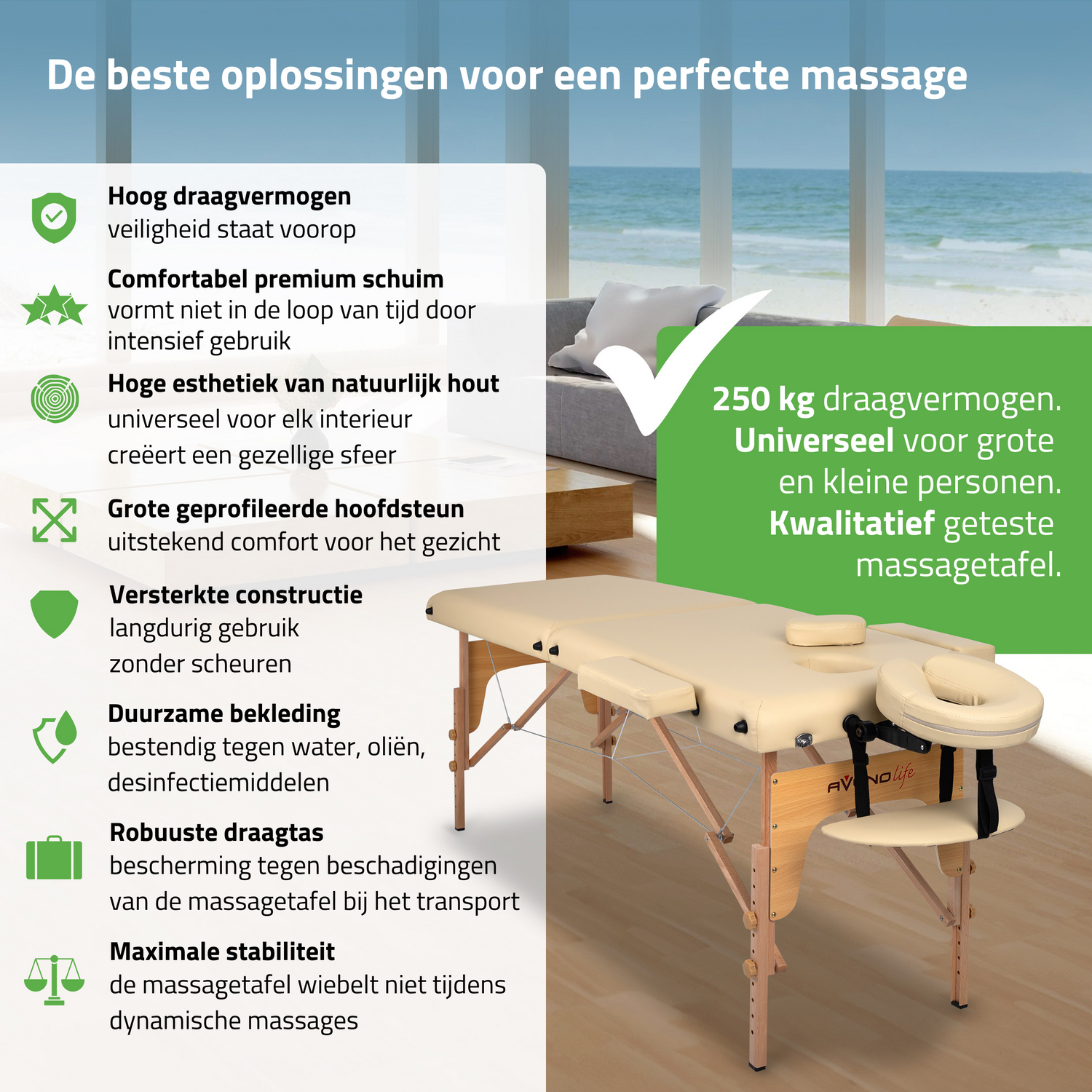 • Inklapbare massagetafel van het merk Aveno Life, houten constructie.