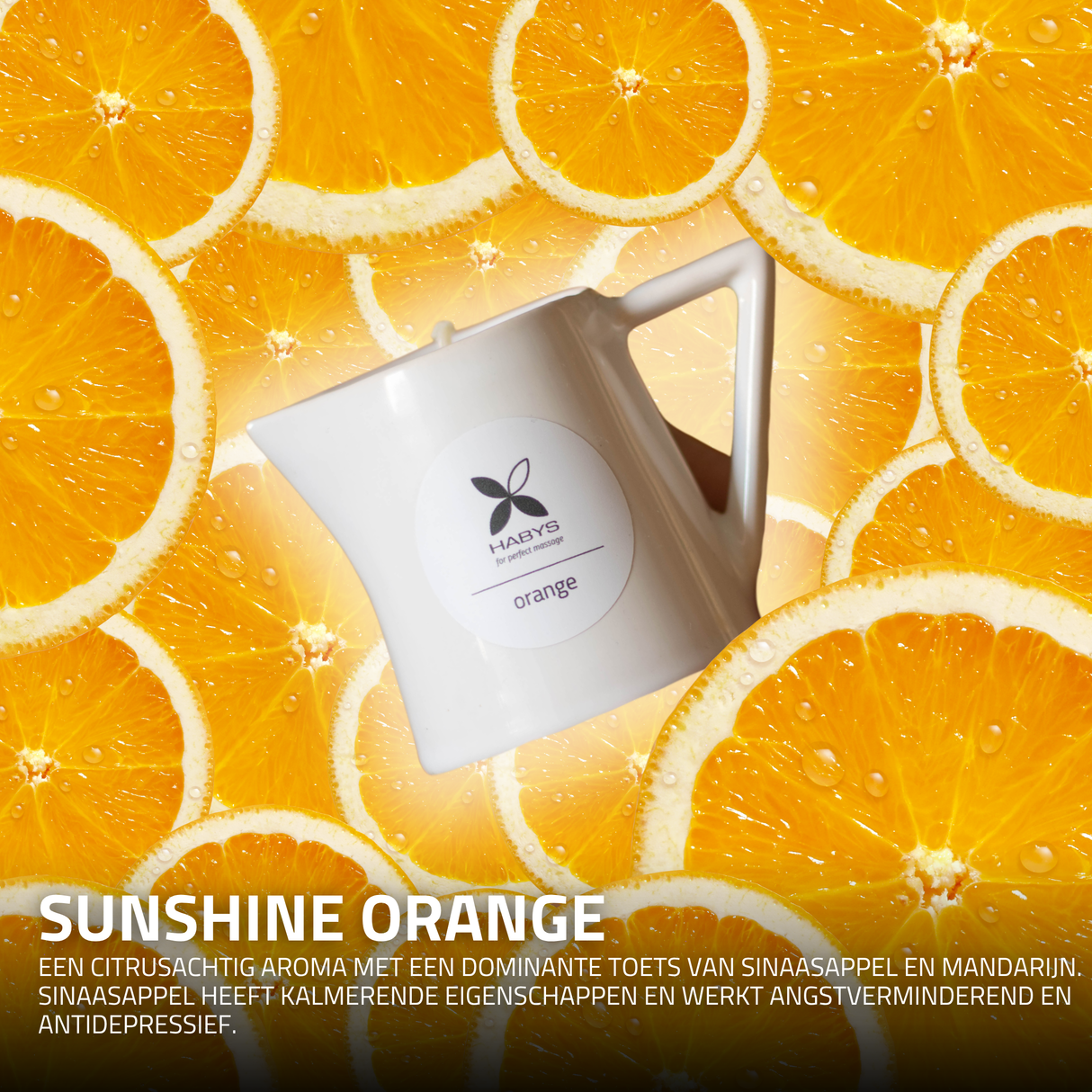 Sunshine Orange: is een citrusgeur met dominante tonen van sinaasappel en mandarijn. Daarnaast heeft sinaasappel kalmerende, angstverminderende en antidepressieve eigenschappen.