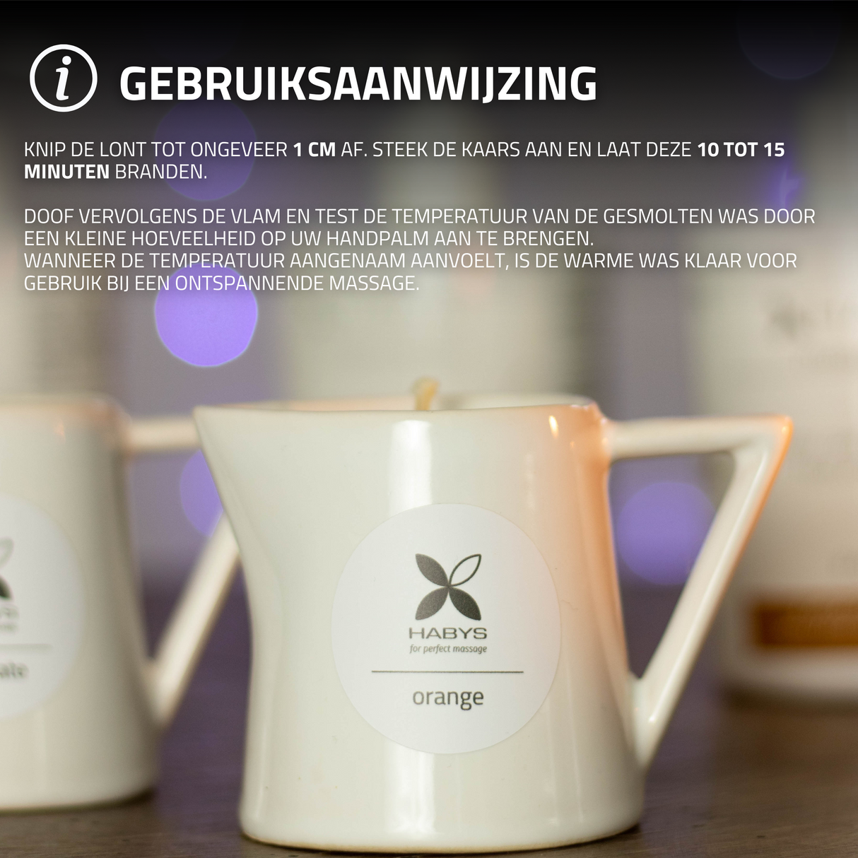 Toepassing: Knip voor het gebruik van de massagekaars de lont tot ongeveer 1 cm en steek de kaars aan. Na ongeveer 10 tot 15 minuten kunt u de vlam doven en de temperatuur van de was op uw handpalm controleren. Is de temperatuur aangenaam, dan kunt u met de warme was masseren.