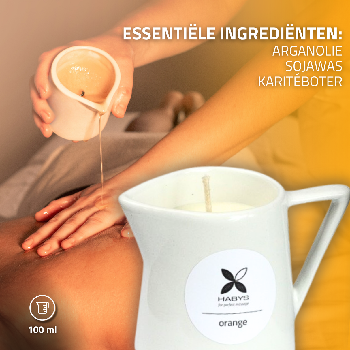 De Massagekaars Sunshine Orange bestaat uit natuurlijke ingrediënten. Bij het smelten van de was ontstaat een aangename vloeibare substantie, en de lichaamsmassagekaars overtuigt met een ontspannende geur.