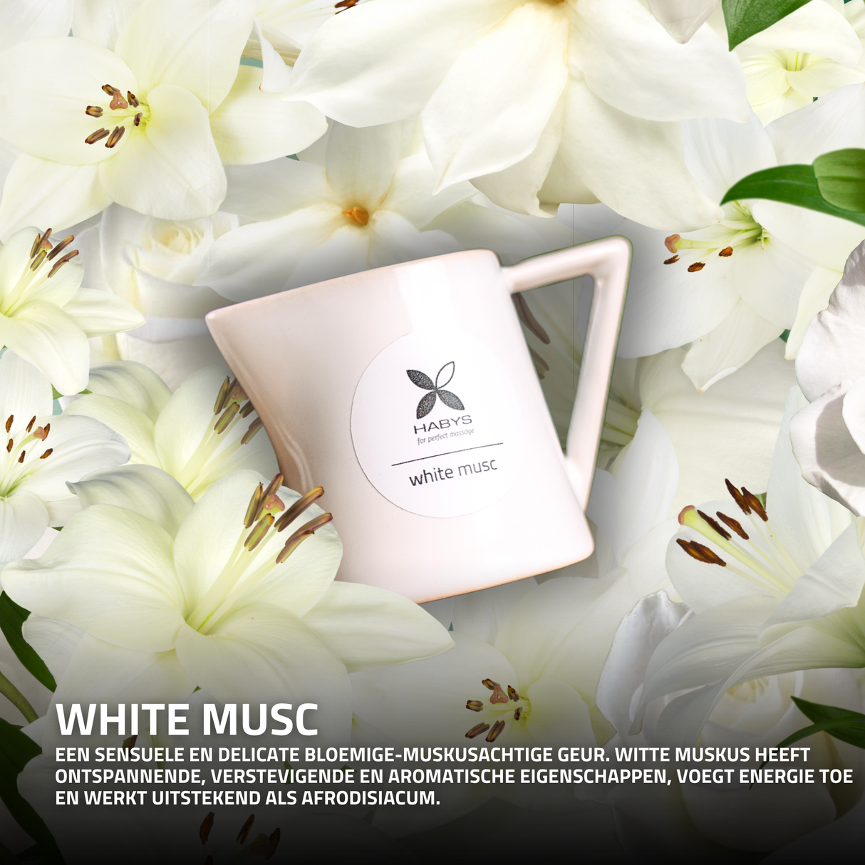 White Musc: Deze massagekaars heeft een sensueel, zacht bloemig en muskusachtig aroma. White Musc biedt ontspannende, verstevigende en aromatische eigenschappen, geeft energie en is een uitstekend afrodisiacum.