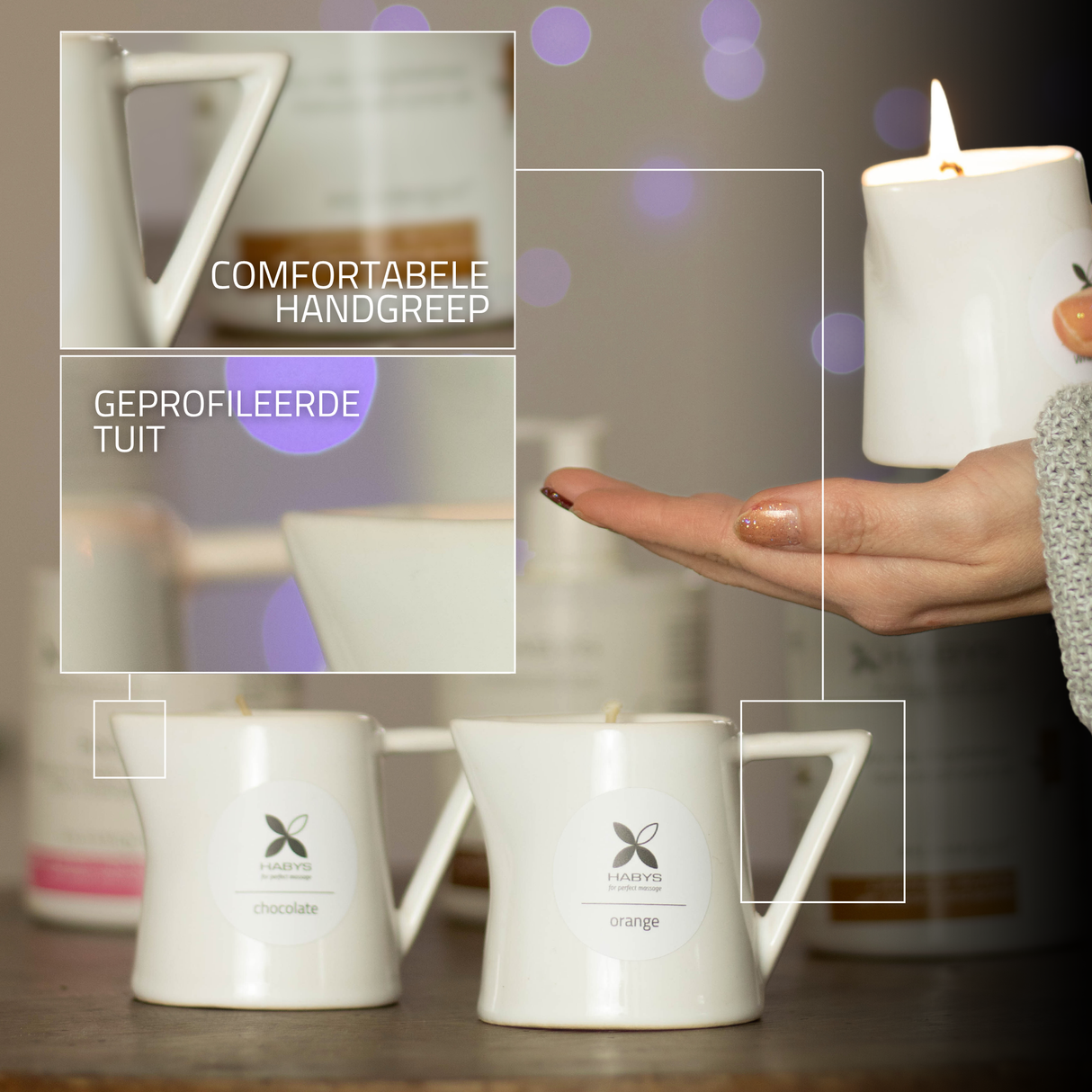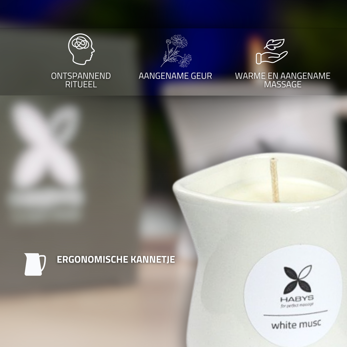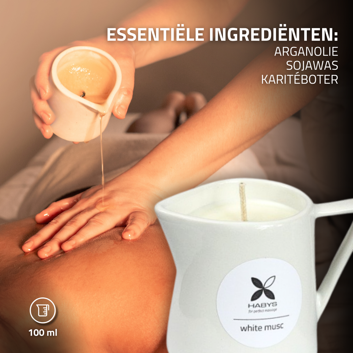 Onze massagekaarsen zijn gemaakt van natuurlijke ingrediënten. Als masseur kunt u met de massagekaars White Musc uw aanbod uitbreiden met een extra ontspannende massagetechniek. Bij het smelten van de lichaamsmassagekaars ontstaat een aangename, vloeibare was, en u verwent uw cliënten met een heerlijke geur.