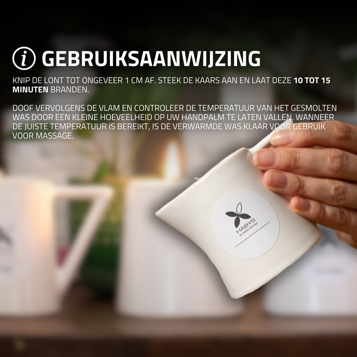 Toepassing: Knip eerst de lont tot ongeveer 1 cm en steek de kaars aan. Na 10 tot 15 minuten dooft u de vlam. Controleer voor de massage de temperatuur van de was met een kleine hoeveelheid in uw handpalm. Als de temperatuur aangenaam is, kunt u met de massage beginnen.