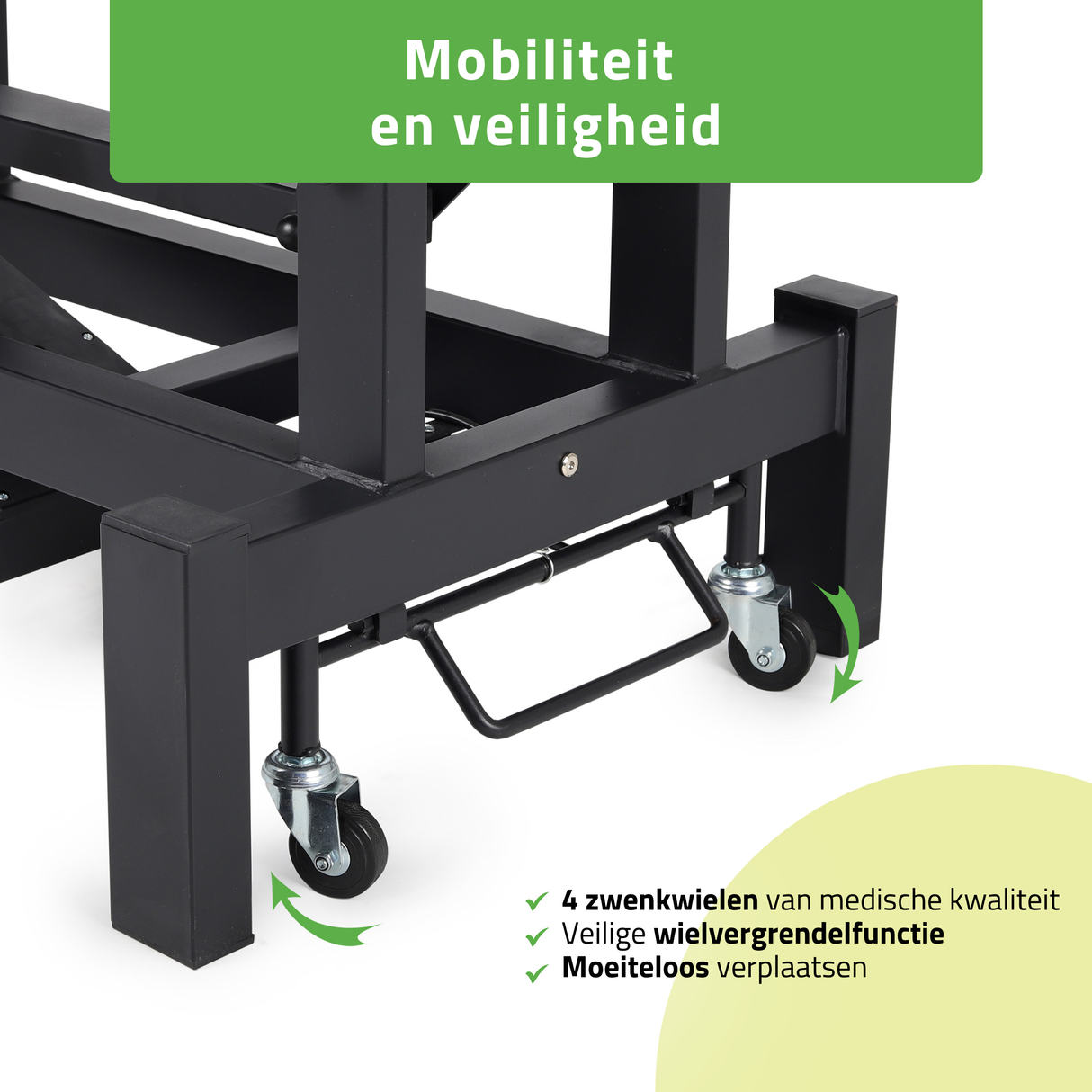 - Verrijdbaar systeem met vergrendeling: De behandeltafel is uitgerust met 4 zwenkwielen, waarvan 2 draaibaar, waardoor verplaatsen moeiteloos gaat.