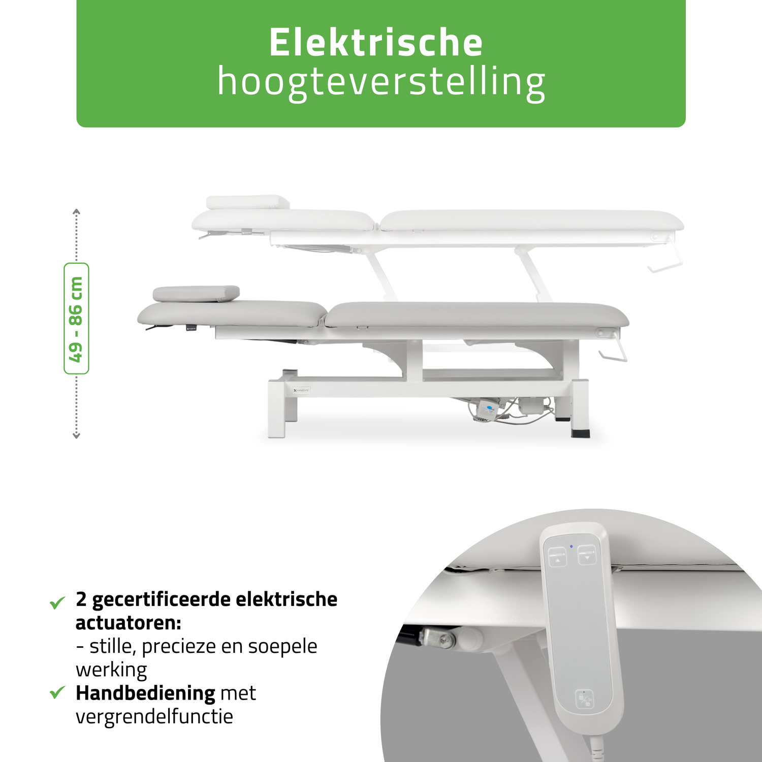 - Elektrische hoogteverstelling: De Fortis 2 tafel is uitgerust met een stille, gecertificeerde elektromotor die een precieze hoogteverstelling mogelijk maakt van 49 cm tot 86 cm.