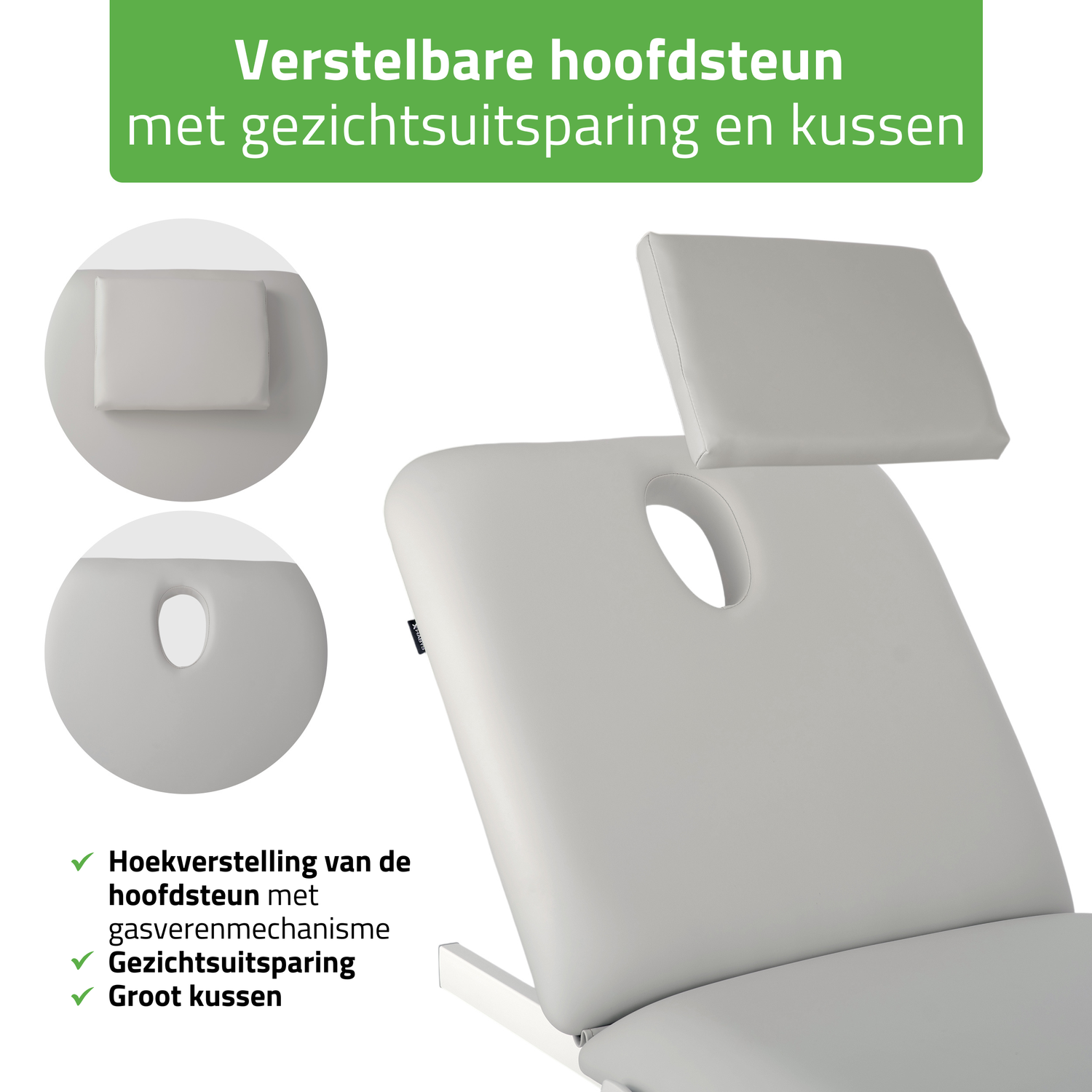 - Verstelbare hoofdsteun met gezichtsuitsparing en kussen: De verstelbare hoekspecificatie van de hoofdsteun, evenals het gasveermechanisme, zorgen voor een stille en precieze aanpassing van de patiëntenpositie tijdens de therapie. De gezichtsuitsparing in de tafel maakt vrij ademen mogelijk in de "buikligging". Het grote kussen bedekt het uitsnede en biedt comfortabele ligpositie in "rug-" of zijligging.