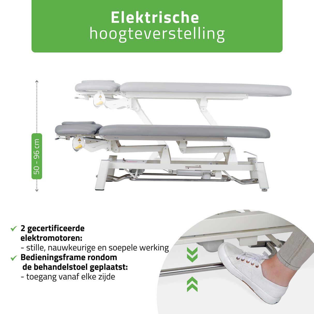 - Elektrische hoogteverstelling: een gecertificeerde elektromotor zorgt voor een gelijkmatige, precieze en stille hoogteverstelling van de tafel tussen 50 en 96 cm. Dit garandeert optimaal werkcomfort voor de therapeut en gemak voor de patiënt. De flexibele hoogteverstelling beschermt de rug van de behandelaar en verbetert de ergonomie tijdens de behandeling. Een lage instap maakt het patiënten bovendien makkelijker om veilig op en van de tafel te stappen.