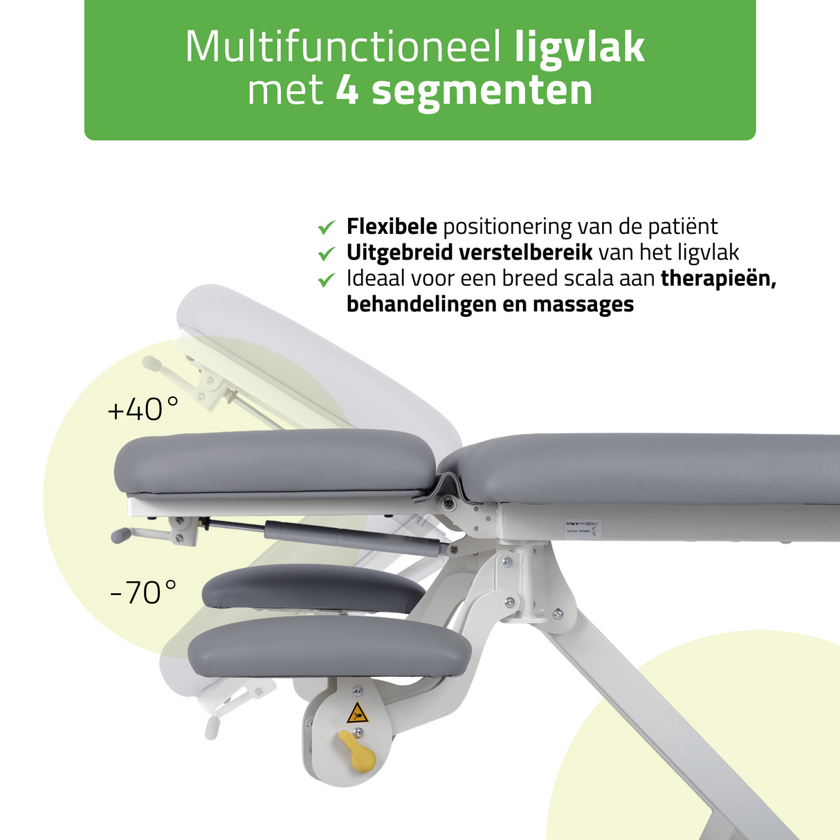 biedt de patiënt maximaal comfort, zowel in rug- als buikligging, zelfs tijdens lange en intensieve behandelingen. De gasveerverstelling maakt hoekaanpassingen mogelijk van -70° tot +40°. - Hoogteverstelling via rondom bedienbaar bedieningsframe: