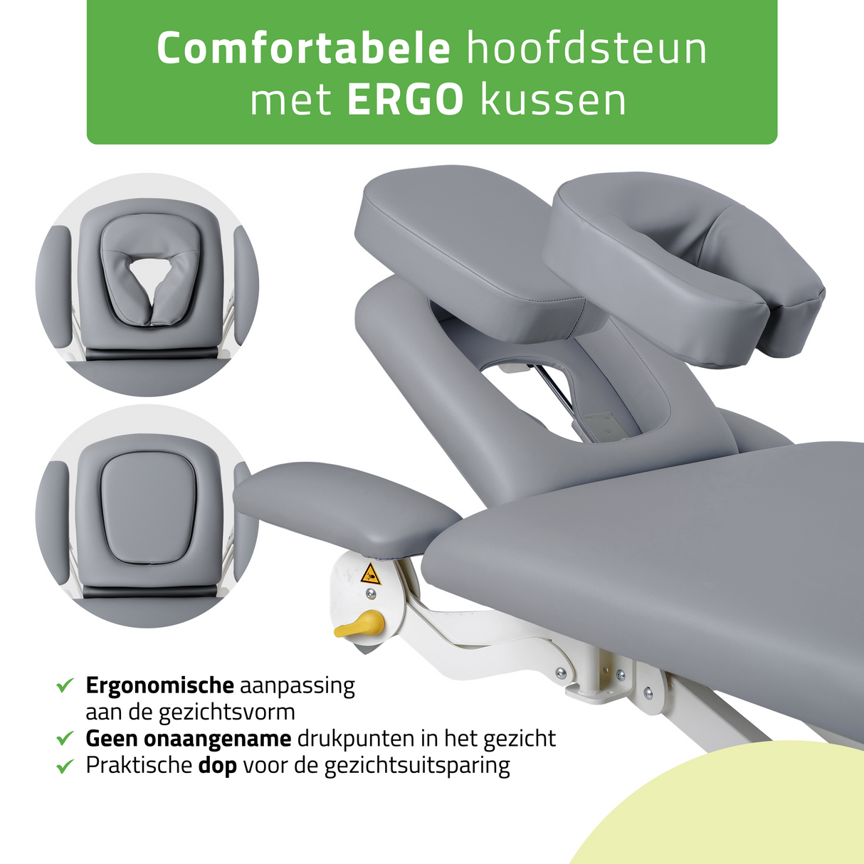 voor een precieze en comfortabele positionering van de patiënt en maximale efficiëntie tijdens de therapie. - Verstelbare hoofdsteun met gezichtsuitsparing en ERGO kussen: