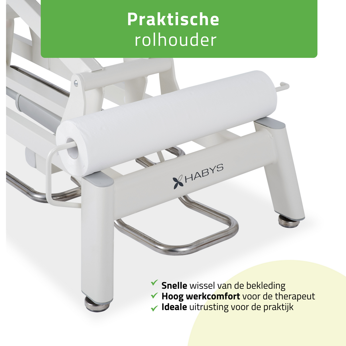 - Houder voor hygiënerol: praktische accessoire die het snel wisselen van onderlegvellen tijdens behandelingen mogelijk maakt.