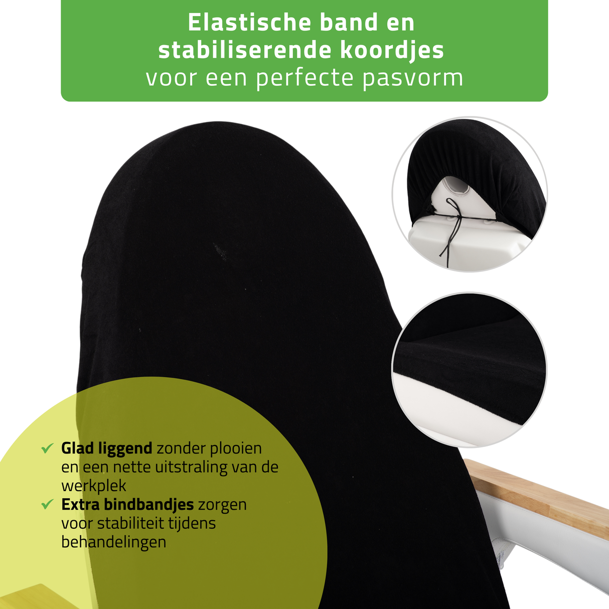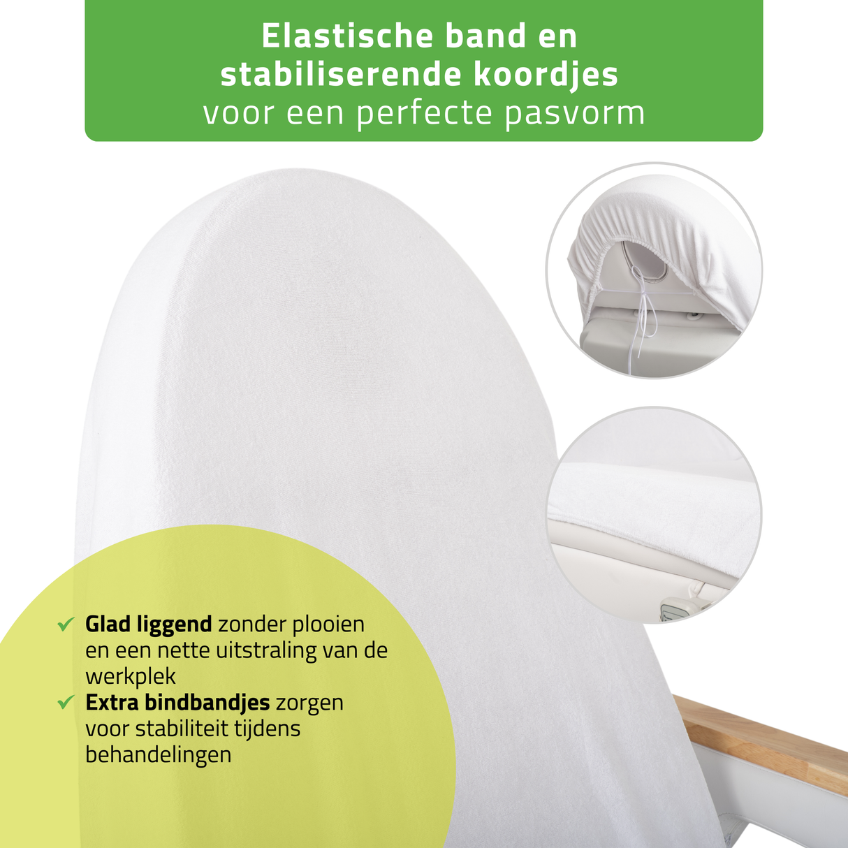 Rondom ingenaaide elastische band en extra stabiliserende koordjes: de elastische band maakt het snel en eenvoudig aanbrengen van de hoes mogelijk en zorgt voor een gelijkmatige pasvorm op de stoel of tafel. Extra koordjes verbeteren de pasvorm, vooral bij het hoofdgedeelte, en houden de hoes gedurende de hele behandeling stevig op zijn plaats.