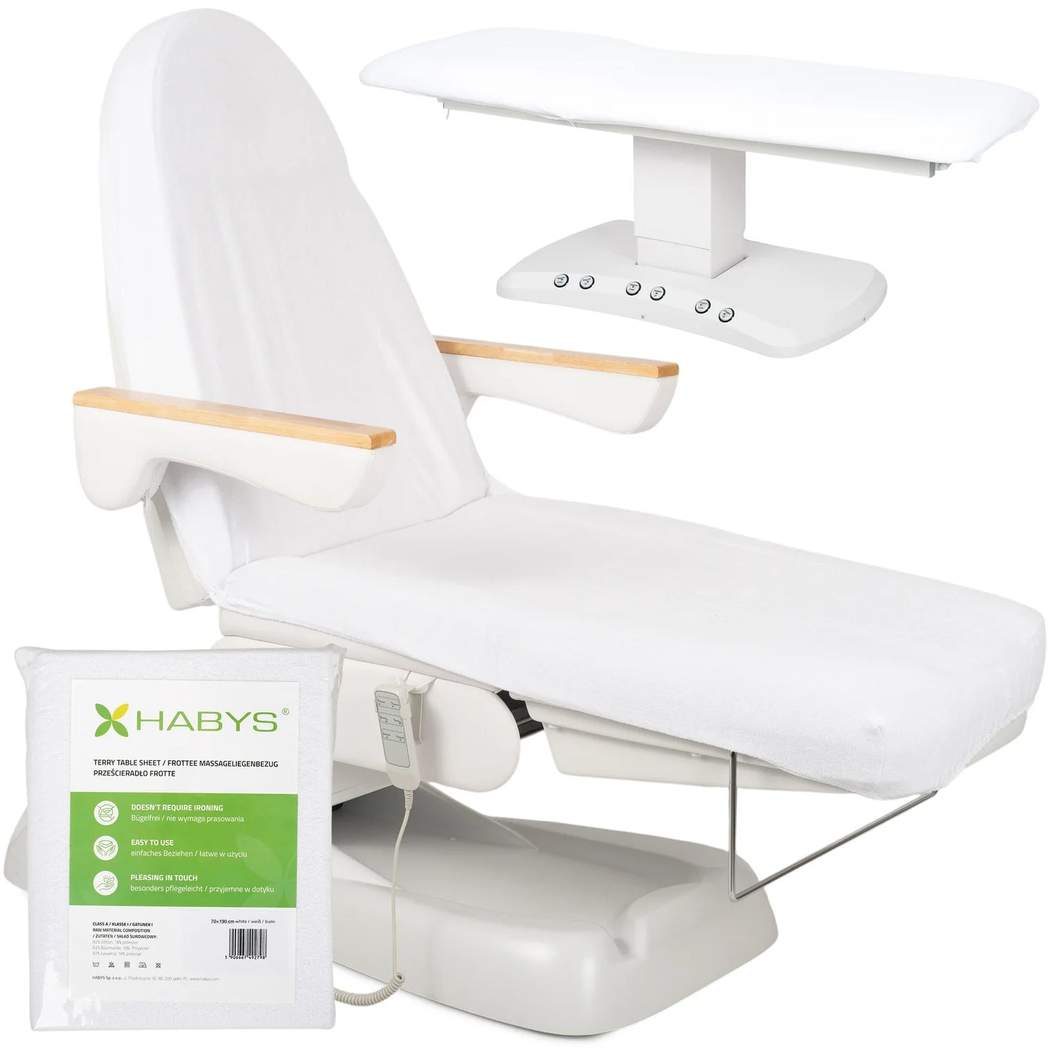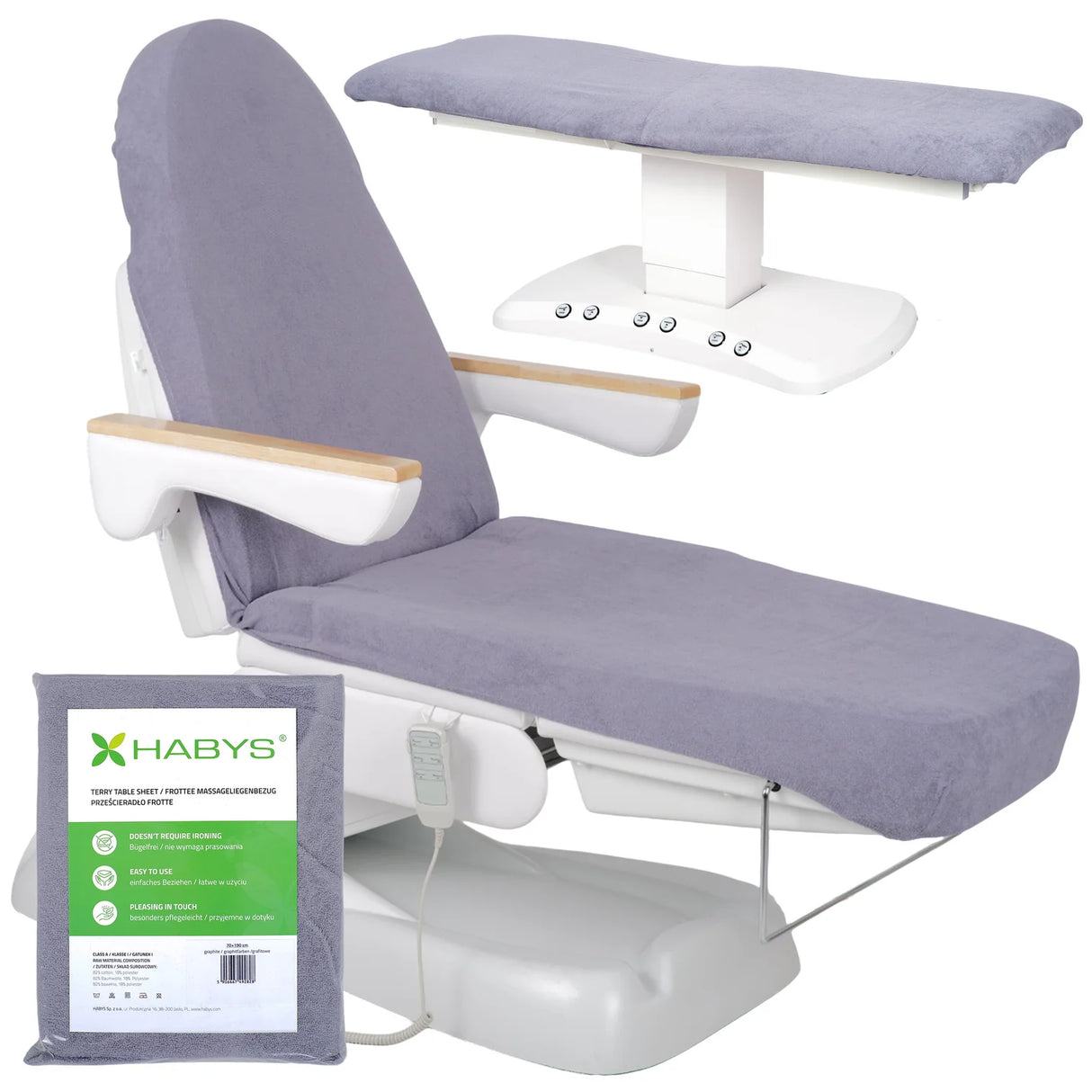 Universele pasvorm voor cosmetische stoelen, behandeltafels en massagetafels: de hoes is speciaal ontworpen voor cosmetische stoelen en behandeltafels – zowel inklapbare als elektrische modellen – evenals voor inklapbare massagetafels.